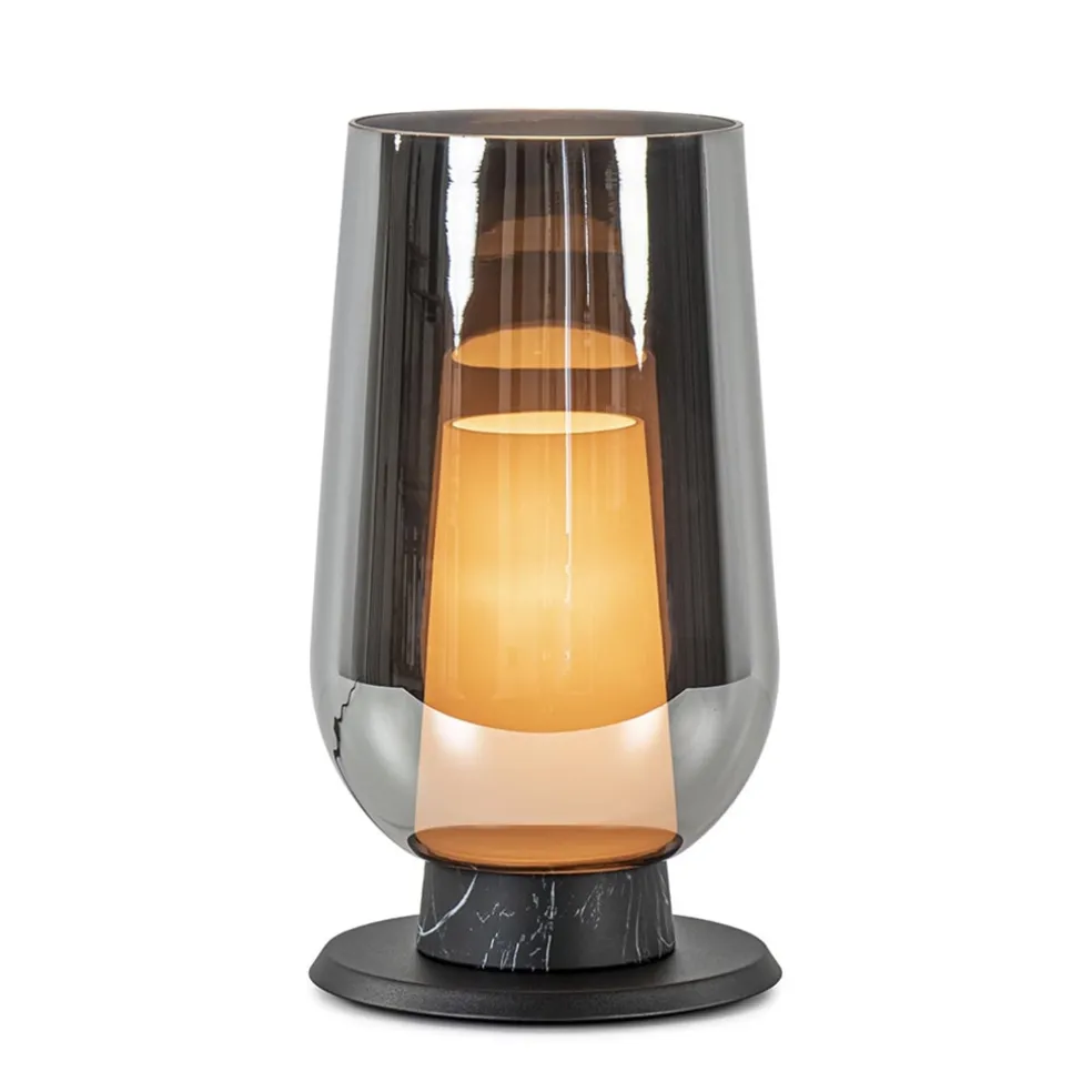 Een chique tafellamp met een luxe uitstraling. De tafellamp is voorzien van luxe materialen als zwart marmer en smoke/titanium glas. Het glas heeft een wit binnen glas wat de tafellamp een mooi effect geeft als de verlichting aan staat. Een sfeervolle toevoeging voor op een dressoir, bijzettafel of het nachtkastje. De tafellamp wordt inclusief snoer van 180 cm geleverd. De schakelaar bevindt zicht op 30 cm van het armatuur.