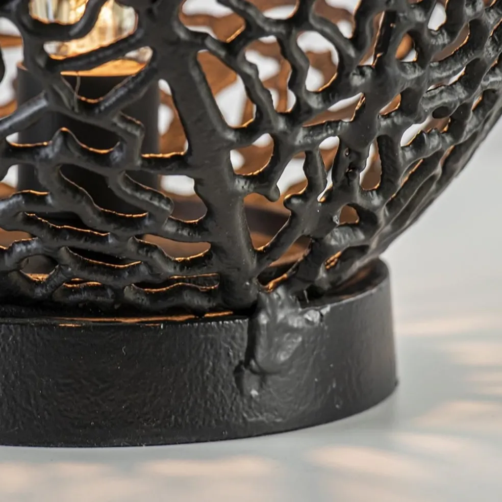 Deze mat zwarte tafellamp heeft een organisch opengewerkt patroon dat doet denken aan de nerven van een blad. Dit geeft de tafellamp een dramatisch uiterlijk. Uitstekend geschikt voor het botanische interieur, maar deze tafellamp sluit ook perfect aan bij het wabi sabi gevoel van het Japandi interieur. Deze lamp staat mooi in de woonkamer op het dressoir of de vensterbank, maar ook in de hal of de slaapkamer! Door de open structuur raden wij u aan om te kiezen voor een decoratieve lichtbron.