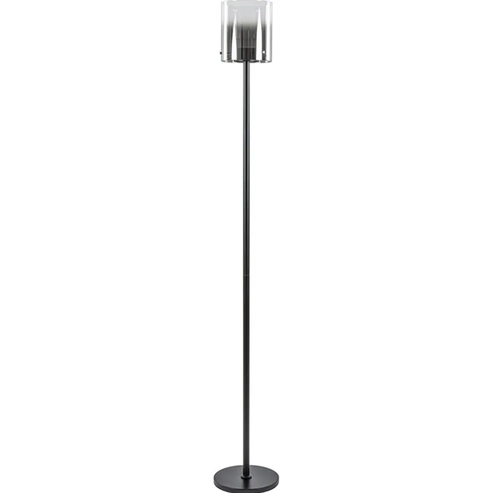 Een moderne vloerlamp met een luxe en chique uitstraling. De staande lamp is voorzien van LED en is daardoor energiezuinig. De LED vloerlamp bestaat uit een mat zwart armatuur en een glazen kap. De cilinder-vormige kap is voorzien van een verloop van titanium/smoke naar helder glas. Dit geeft de vloerlamp echt die luxe uitstraling die mooi is te combineren in een strak klassiek, modern of chique interieur. De LED staande lamp heeft een zwart snoer met een lengte van 230 cm, en een vloerdimmer op 70 cm van die ronde voet. Een mooie sfeervolle toevoeging aan het interieur.