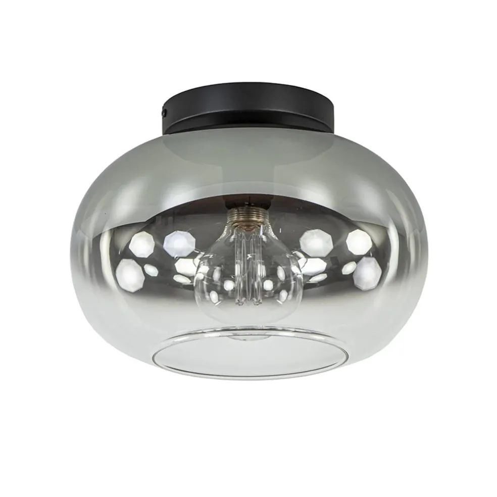 Retro met een moderne trendy twist. Deze plafondlamp past helemaal bij de huidige woontrends en is te combineren in diverse woonstijlen. De ronde plafondlamp bestaat uit een metalen bevestiging die is uitgevoerd in het mat zwart, en een smoke glazen kap met een verloop naar helder glas. Het smoke/titanium gedeelte geeft de plafondlamp een luxe en chique uitstraling. De plafondlamp is dimbaar middels een externe dimmer (exclusief) en wordt geleverd exclusief lichtbron.