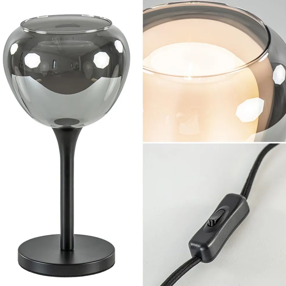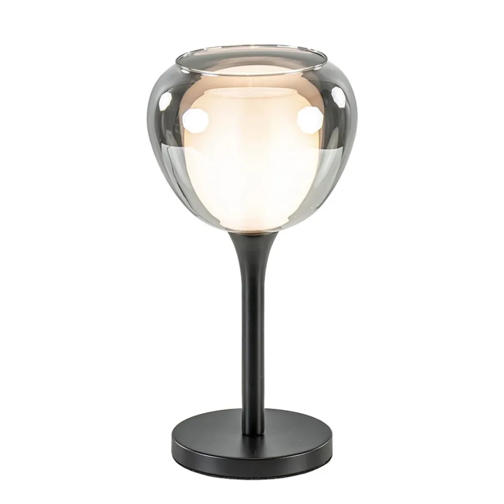 Een mooie sfeervolle tafellamp met een dubbele laag. De moderne tafellamp is voorzien van een smoke glazen kap die met zijn titanium look een mooi spiegelend effect heeft wanneer de lamp is uitgeschakeld. Schakelt u de lamp in, dan komt er een wit binnenglas tevoorschijn die zorgt dat het licht mooi diffuus wordt verspreid. Het mat witte binnenglas zorgt er tevens voor dat u niet direct in de lichtbron kijkt. Het smoke glas wordt donker transparant wanneer de lamp is ingeschakeld en zorgt zo voor een luxe uitstraling. Het glas is bevestigd op een zwart metalen armatuur die wordt ondersteund door een ronde voet. Het armatuur is voorzien van een zwart snoer met een lengte van 180 cm, met een knipschakelaar op 30 cm van de lamp. Deze sfeervolle tafellamp is een mooie toevoeging aan uw bijzettafel of kast, maar zorgt ook voor een fijne sfeer op het nachtkastje. De combinatie van het zwart en het smoke glas zorgt dat de tafellamp in diverse woonstijlen kan worden toegepast.