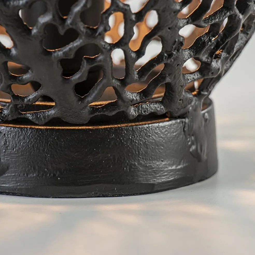 Deze mat zwarte tafellamp heeft een organisch opengewerkt patroon dat doet denken aan de nerven van een blad. Dit geeft de tafellamp een dramatisch uiterlijk. Uitstekend geschikt voor het botanische interieur, maar deze tafellamp sluit ook perfect aan bij het wabi sabi gevoel van het Japandi interieur. Deze lamp staat mooi in de woonkamer op het dressoir of de vensterbank, maar ook in de hal of de slaapkamer! Door de open structuur raden wij u aan om te kiezen voor een decoratieve lichtbron.
