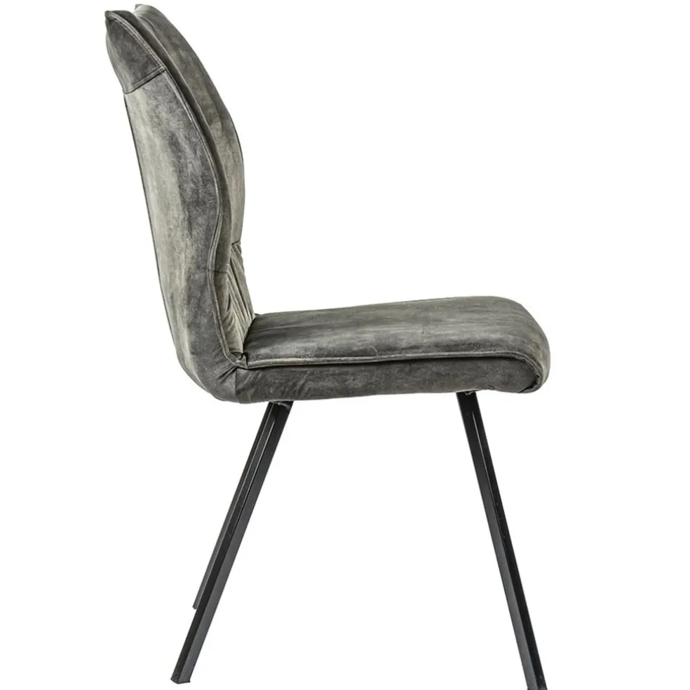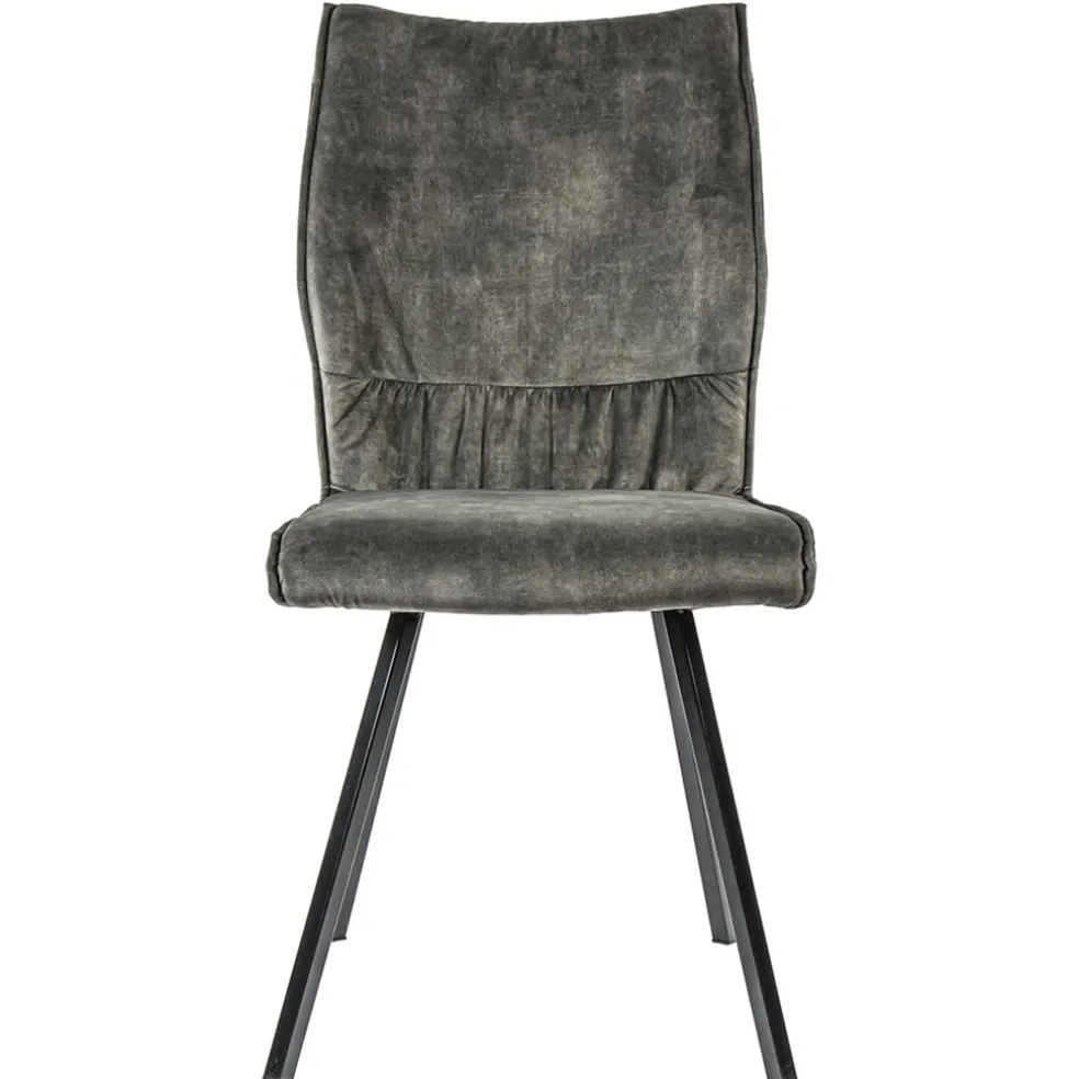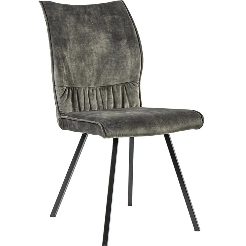 Een trendy stoeltje met een landelijke uitstraling. De eetkamerstoel heeft een zitting die doorloopt in de rug en volledig is voorzien van een velourse stof. Dit geeft een luxe look en feel aan het stoeltje. De pootjes zijn van metaal en voorzien van een zwarte finish. Leuk met zes rond een tafel en te combineren in diverse kleuren.