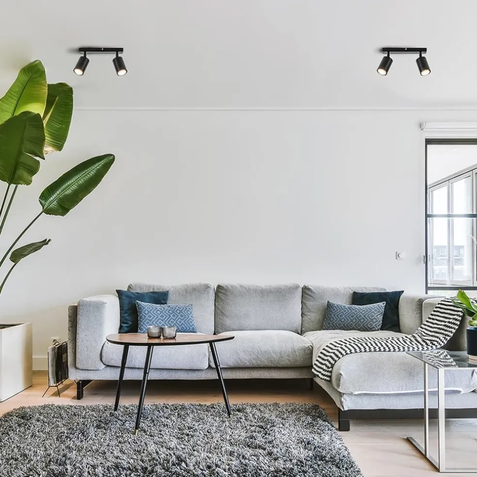 Prima geschikt voor een kleine kamer, hal of overloop. Deze 2-lichts opbouwspot zorgt voor genoeg licht een in wat kleinere ruimte. De plafondspot is gemaakt van metaal en uitgevoerd in het mat zwart. De cilinder vormige spots zijn naar wens te verstellen door deze te draaien en/of kantelen. Ideaal om naar twee kanten te verlichten. De spots zijn bevestigd op een kleine plafondbalk van 25 cm die eveneens in het mat zwart is afgewerkt. De 2-lichts opbouwspot is dimbaar dmv een externe dimmer (exclusief) en wordt geleverd zonder lichtbron (2x GU10).