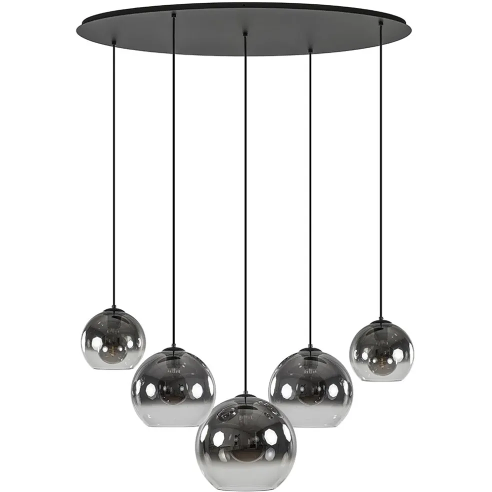 Een prachtige hanglamp voor boven de eettafel. Een nieuwe trend in de verlichting is de ovale plafondplaat. Deze hanglamp heeft er een van maar liefst 100 cm lang. De plaat is van metaal en afgewerkt met een mat zwarte finish. De bevestiging zelf heeft een afmeting van 97×35 cm, de afwerktplaat heeft een afmeting van 100×35 cm. Over de plaat zijn 5 lichtpunten verdeeld. Deze zijn voorzien van zwarte stof omwonden snoeren die naar wens in hoogte zijn te verstellen. De maximale hoogte is 180 cm. De mat zwarte ovale plaat is gecombineerd met ronde glazen bollen verdeeld over 3 afmetingen. De combinatie van het mat zwart en het titanium/smoke glas geeft de hanglamp een luxe chique uitstraling die mooi is toe te passen in diverse woonstijlen. De ovale hanglamp met glazen bollen is dimbaar middels een externe dimmer en wordt geleverd zonder lichtbron (5x E27).
