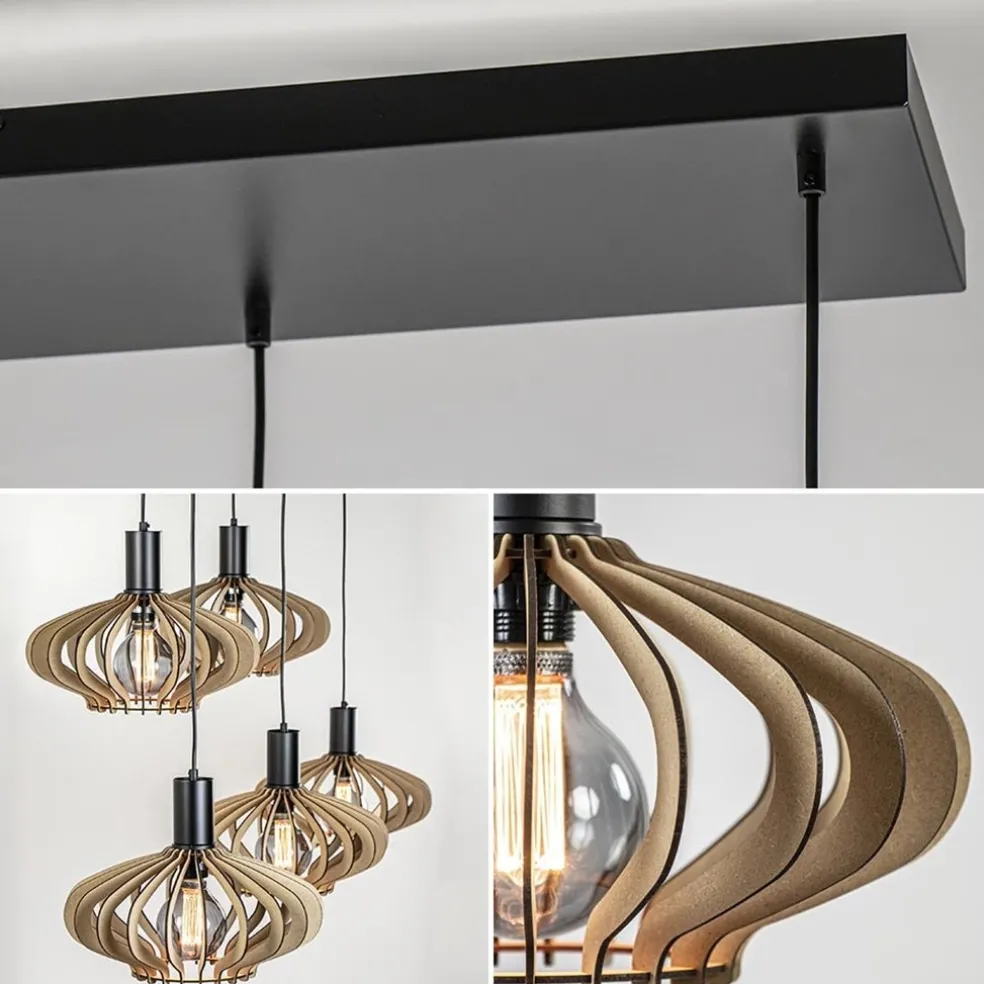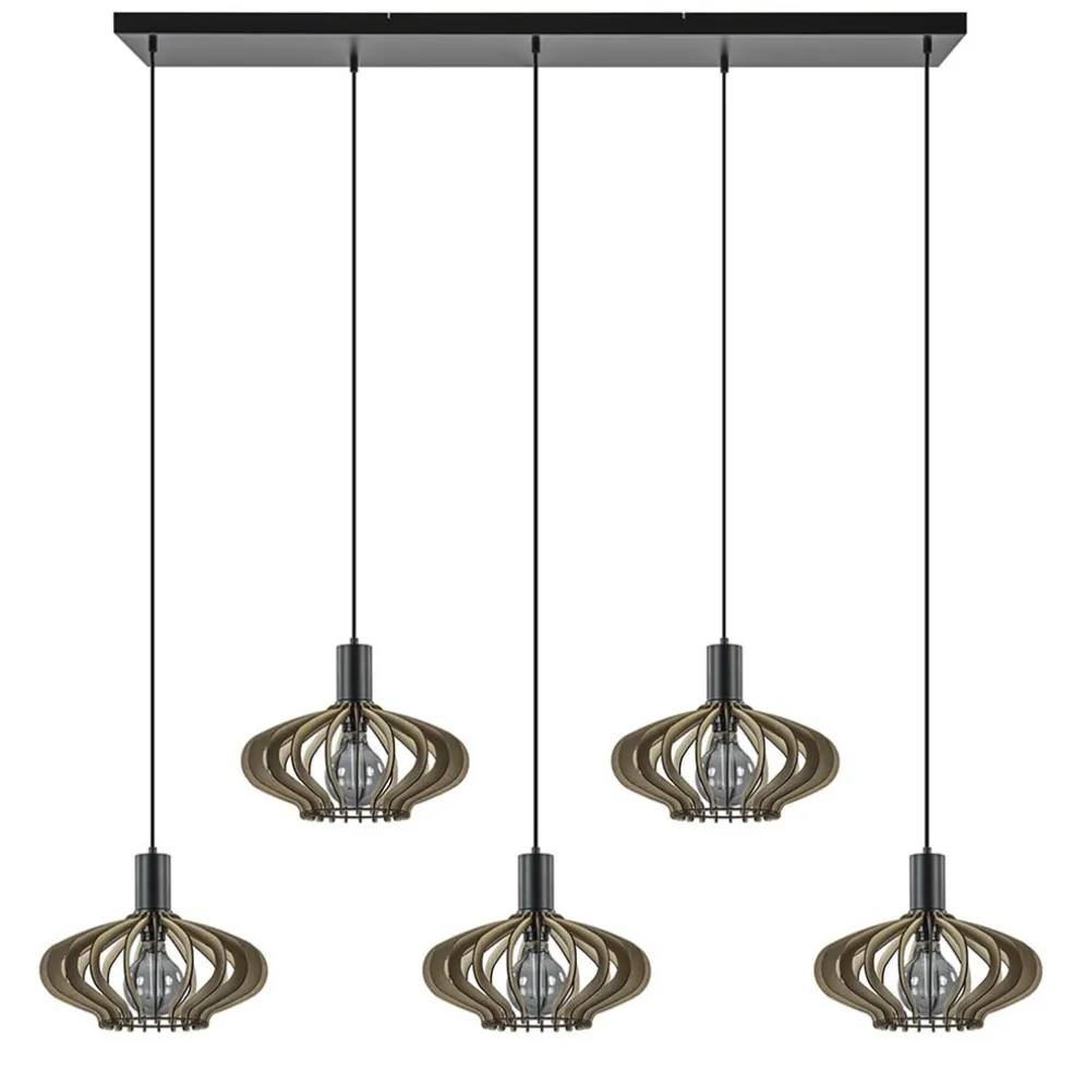 Deze grote hanglamp is een prachtige toevoeging boven een langwerpige of ovale eettafel. De 5-lichts hanglamp is voorzien van een grote plafondplaat van 130×25 cm. Over de zwart metalen plaat zijn 5 lichtpunten evenredig verdeeld zodat er een mooie samenstelling ontstaat. Ieder punt heeft een snoer met daaraan een mat zwarte fitting en een ronde houten kap. De kappen zijn naar wens op hoogte te hangen. De maximale hoogte van de lamp is 160 cm. De ronde kappen zijn gemaakt van hout en uitgevoerd in een naturel tint. De kappen bestaan uit lamellen die op een ring samen komen. Dit geeft een open structuur en zorgt dat er voldoende lichtverspreiding kan plaatsvinden. De 5-lichts hanglamp is dimbaar middels een externe dimmer (exclusief) en wordt zonder lichtbronnen geleverd.