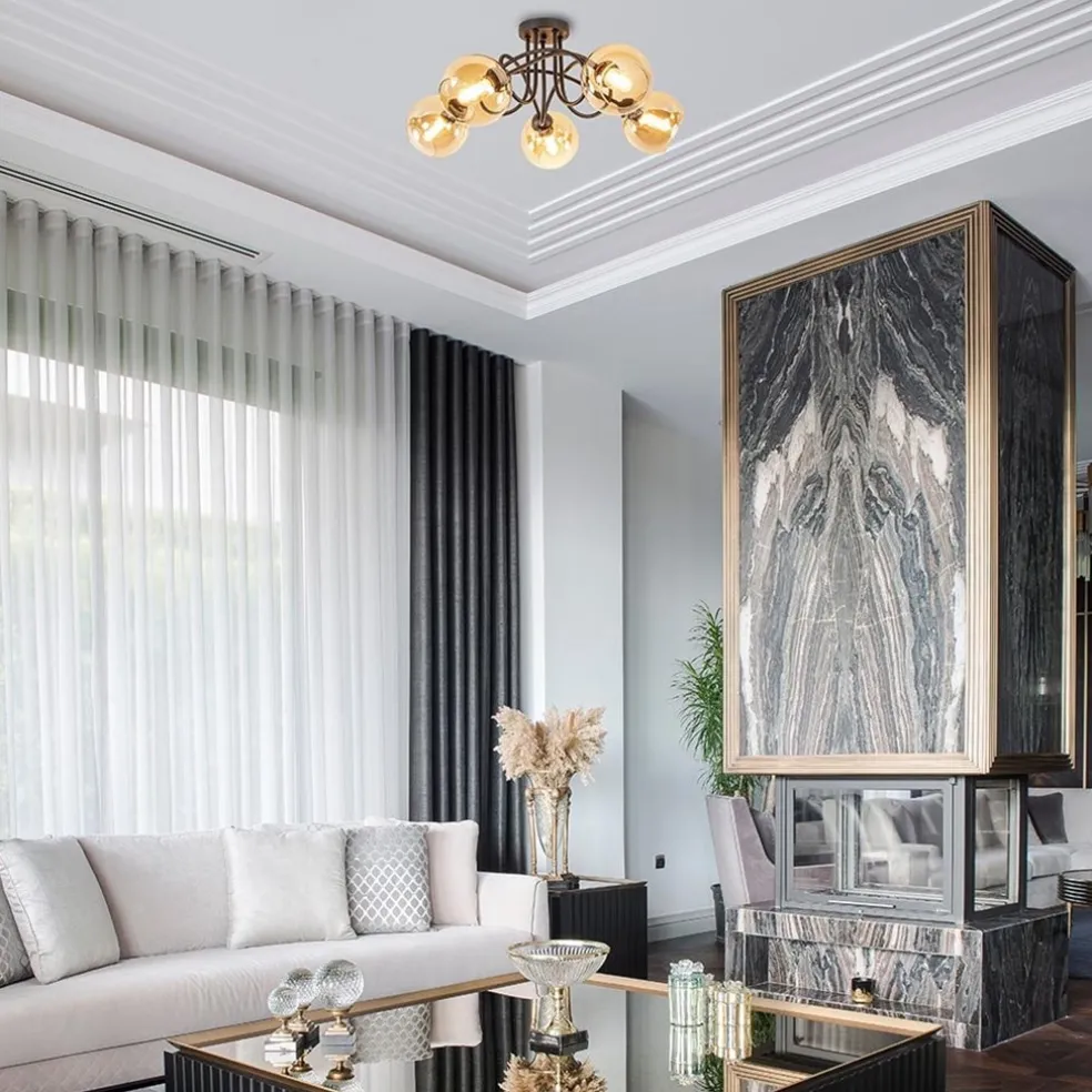Sierlijke trendy 5-lichts plafondlamp. Deze mat zwarte plafondlamp met amber kleurig glas is een echte eyecatcher. Het amber kleurige glas geeft de lamp een mooie warme gloed. Het fraaie armatuur loopt krullend in elkaar over. De lamp is leuk voor in een slaapkamer of een hal en matcht mooi in een klassiek of retro interieur. De sierlijke lamp wordt exclusief lichtbronnen geleverd en is dimbaar middels een externe dimmer (exclusief).