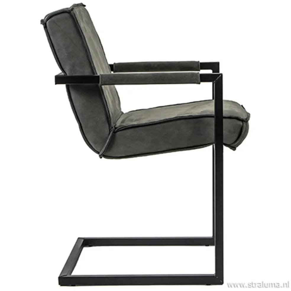 Een trendy modern/landelijke eetkamerstoel uitgevoerd in leder met metalen poten. Het olijf groene leder is van hoge kwaliteit en kan wel tegen een stootje. De dikke kussens zorgen in zowel de rug als de zitting voor een hoog zitcomfort en de metalen armleuningen die zijn voorzien van een leder stuk zorgen ook bij het natafelen voor een ontspannen en relaxte houding aan tafel.