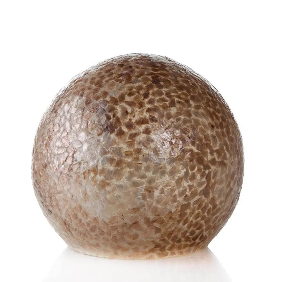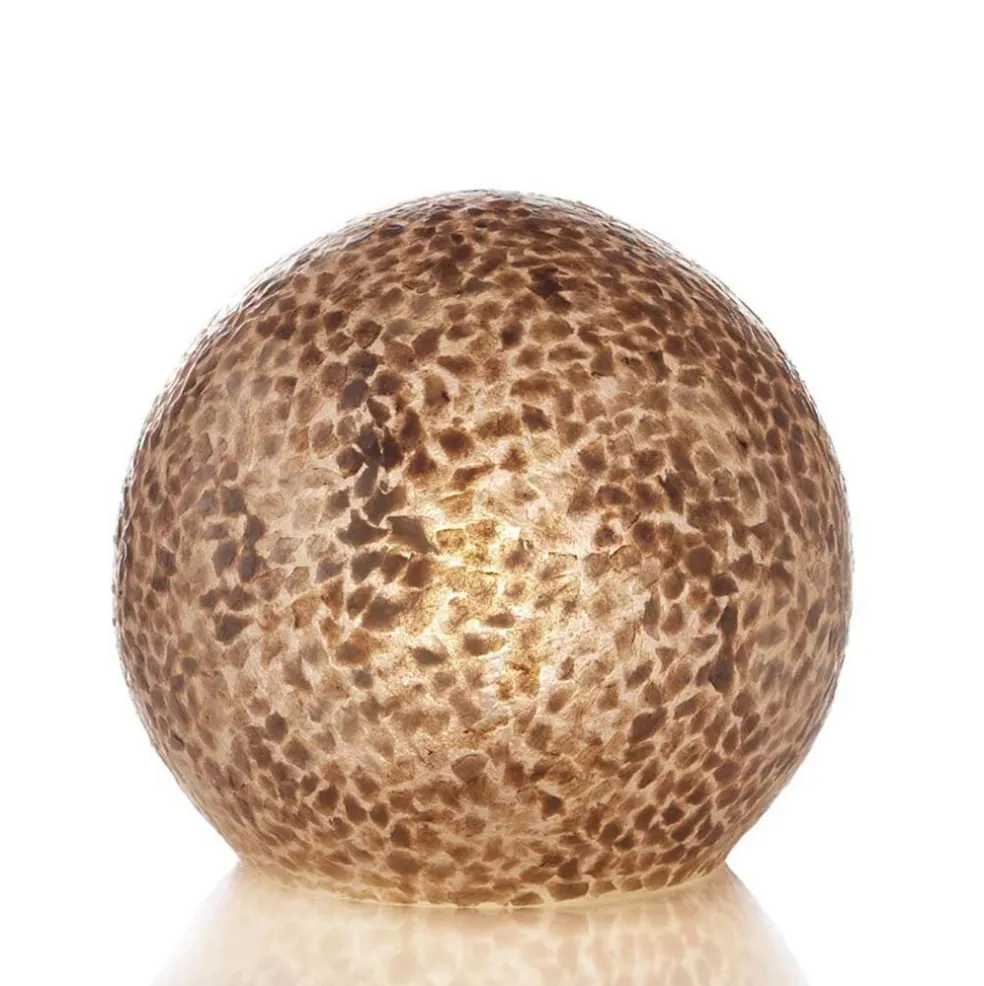 Sfeervolle tafellamp bol. Deze tafellamp is gemaakt van gebroken schelpen. Leuk om te zien wanneer hij niet brand en heel sfeervol als hij wel brand. Dit is geen tafellamp om bij te lezen, maar echt meer om een sfeer te creeëren in de woonruimte. De kleuren zijn heel gemeleerd van creme-beige-bruin en goud, uitermate geschikt voor een beach-ibiza look of lifestyle interieur.