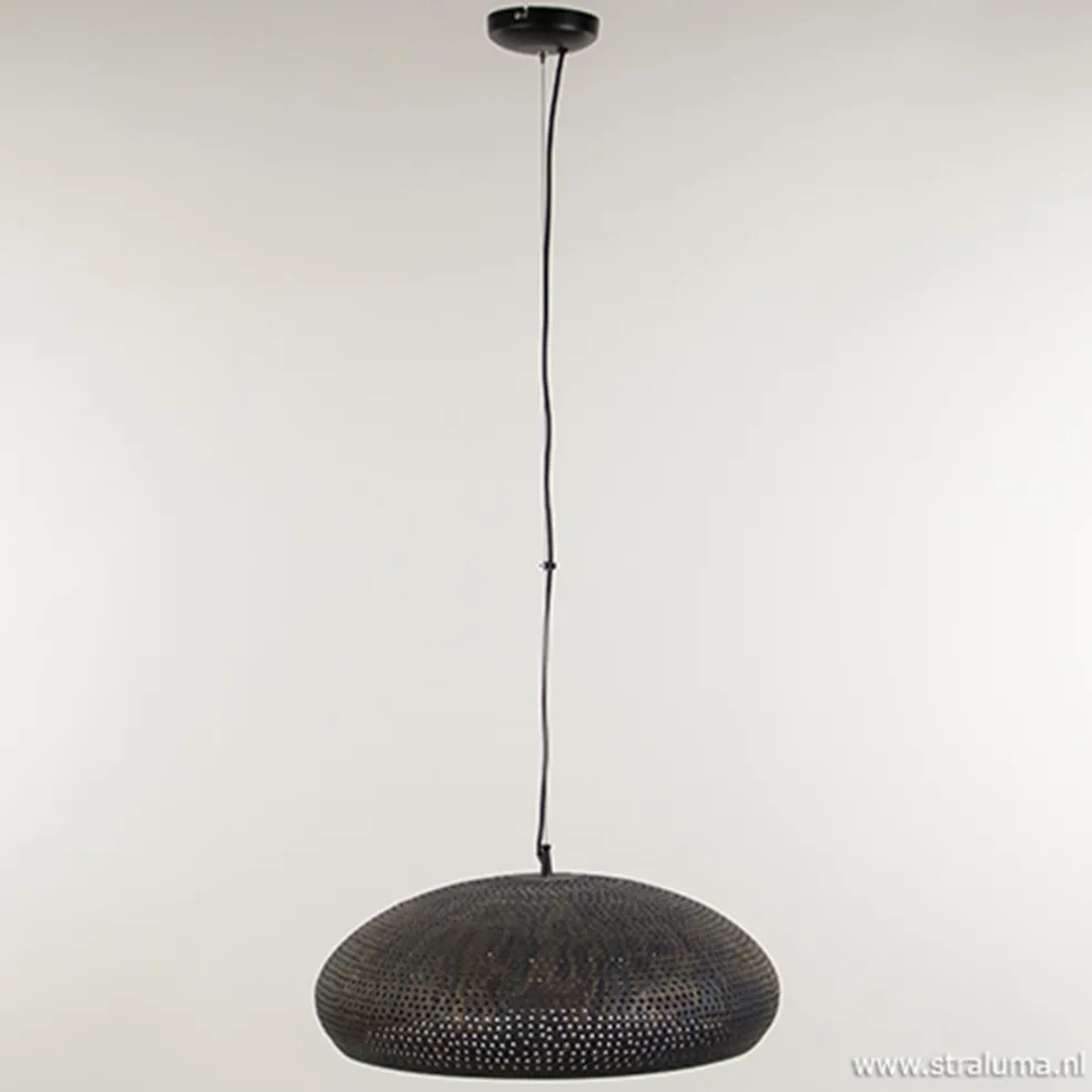 Een metalen hanglamp zoals je ze niet vaak ziet, deze ronde hanglamp. De geperforeerde stalen kap ziet eruit alsof deze in de olie is gedompeld wat de kap een unieke en robuuste look geeft. Door de kleur en het materiaal is de lamp te combineren in een industrieel maar ook een landelijk interieur. De metalen kap heeft een brons-gelige binnenzijde wat voor warme verlichting zorgt. De hanglamp hangt aan een ijzerdraad en het snoer die beide verwerkt zitten in de zwarte plafondbevestiging. Zowel het snoer als het ijzerdraad is in te korten.