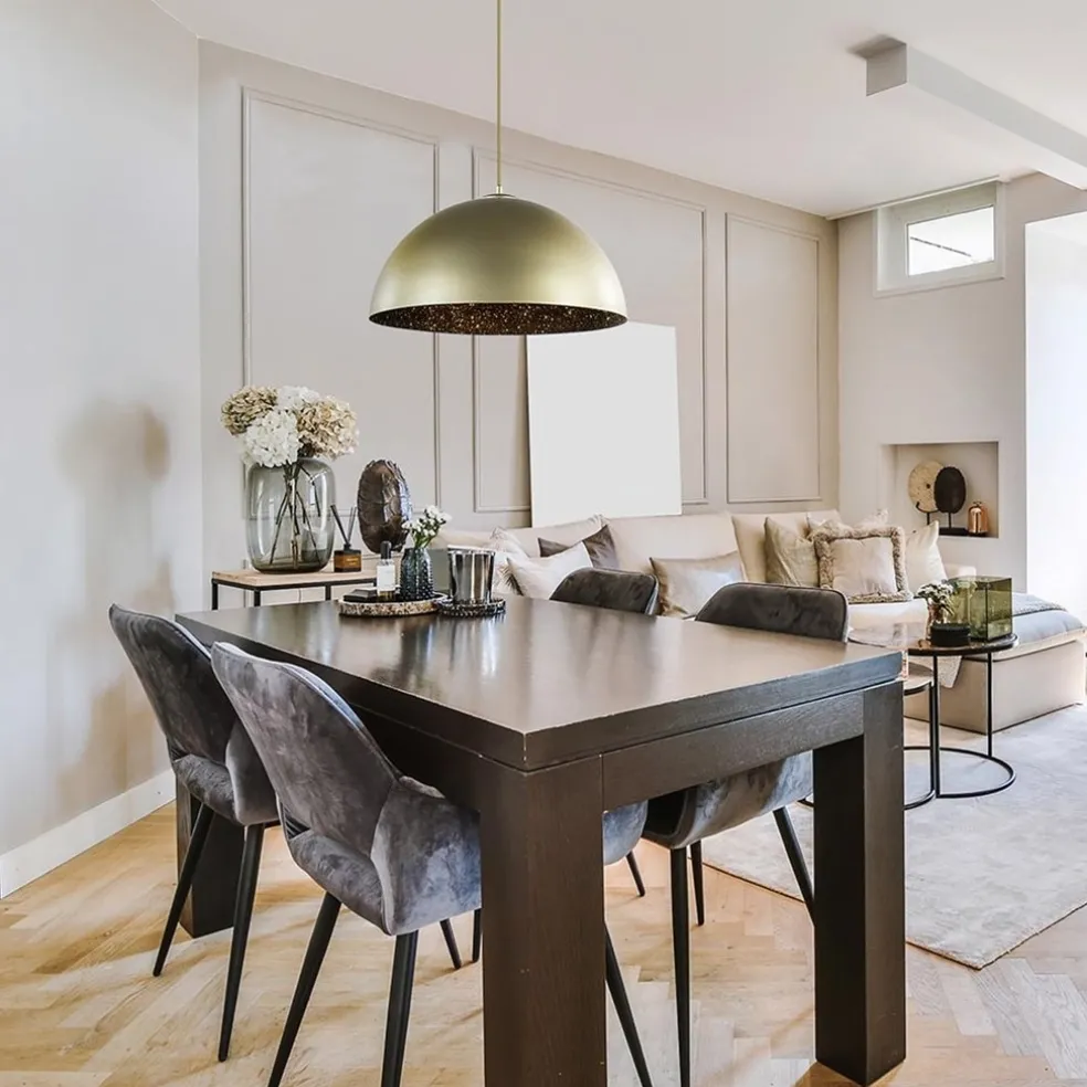 Chique mat gouden hanglamp. De lamp is gemaakt van composiet en is daardoor licht van gewicht. De binnenzijde van deze gouden koepellamp is zwart met gouden spetters. Een uniek design met een speels effect. De koepel heeft een doorsnede van 50 cm en staat prachtig boven een (ronde) eettafel. De chique koepel heeft een hoogte van 160 cm en is naar wens in te korten.