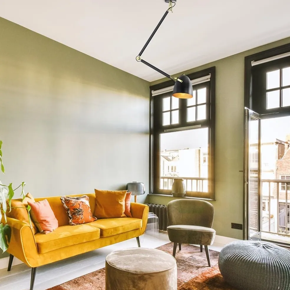 Super praktische hanglamp/plafondlamp met verstelbare arm, hierdoor kunt u deze lamp naar wens verstellen. Mooi design met zwart met goud accenten, dit geeft het geheel een mooie strakke warme uitstraling. De kap zorgt voor sfeer en een warme gloed. Deze verstelbare plafondlamp is bij de kap en plafondbevestiging draaibaar en kantelbaar, tussen de stangen zit ook een scharnier. Door deze mogelijkheden is de lamp in allerlei houdingen in te stellen. Ideaal voor boven de eettafel.