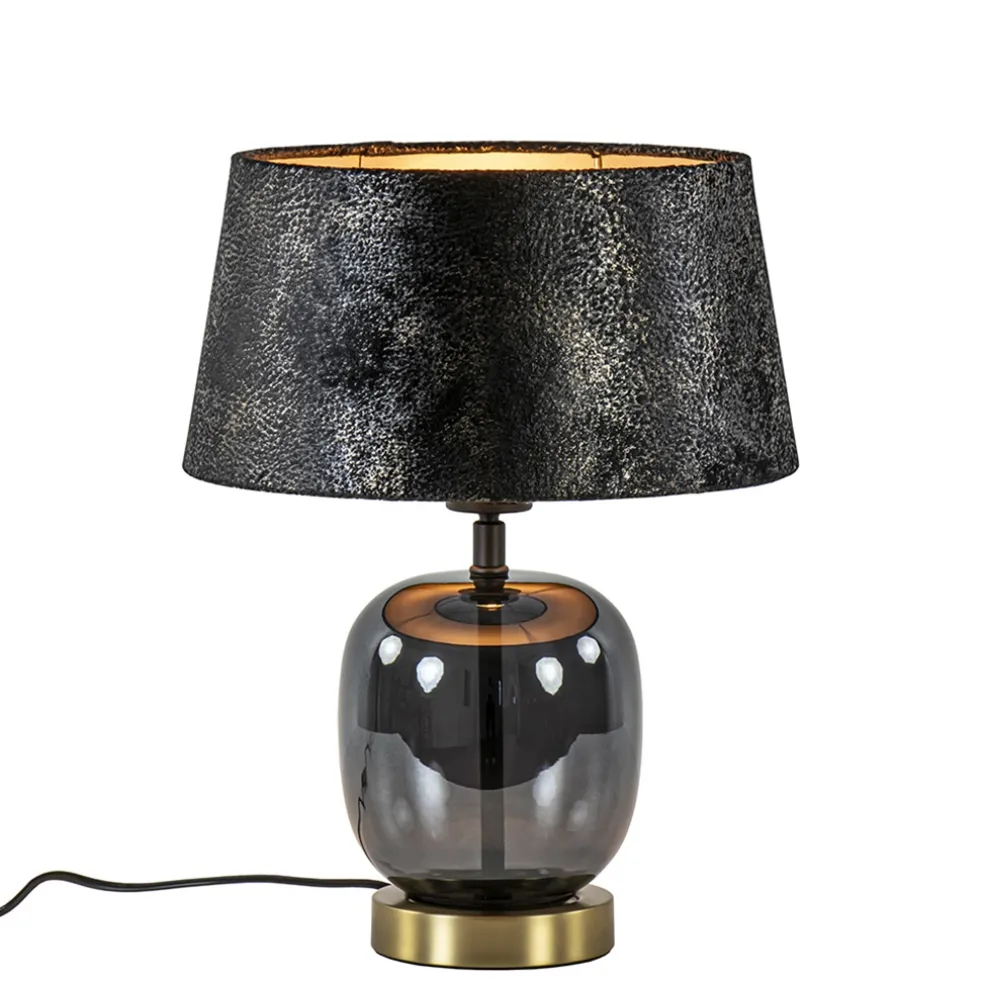Deze kleine maar prachtige lamp heeft een chique en luxe uitstraling door de combinatie van de materialen en kleuren. Zo heeft de tafellamp een glazen voet die is uitgevoerd in het zwart. Dit is gecombineerd met een stoffen kap in het zwart/taupe met een glinstering erin. De combinatie maakt de tafellamp perfect geschikt voor een hotel chic, strak klassiek of luxury interieur. De kap wordt ondersteund door een kogelgewricht zodat u de kap goed recht kunt zetten. De glazen tafellamp met kap heeft een zwart snoer met een lengte van 170 cm en een knipschakelaar op 30 cm. De chique tafellamp wordt geleverd zonder lichtbron.