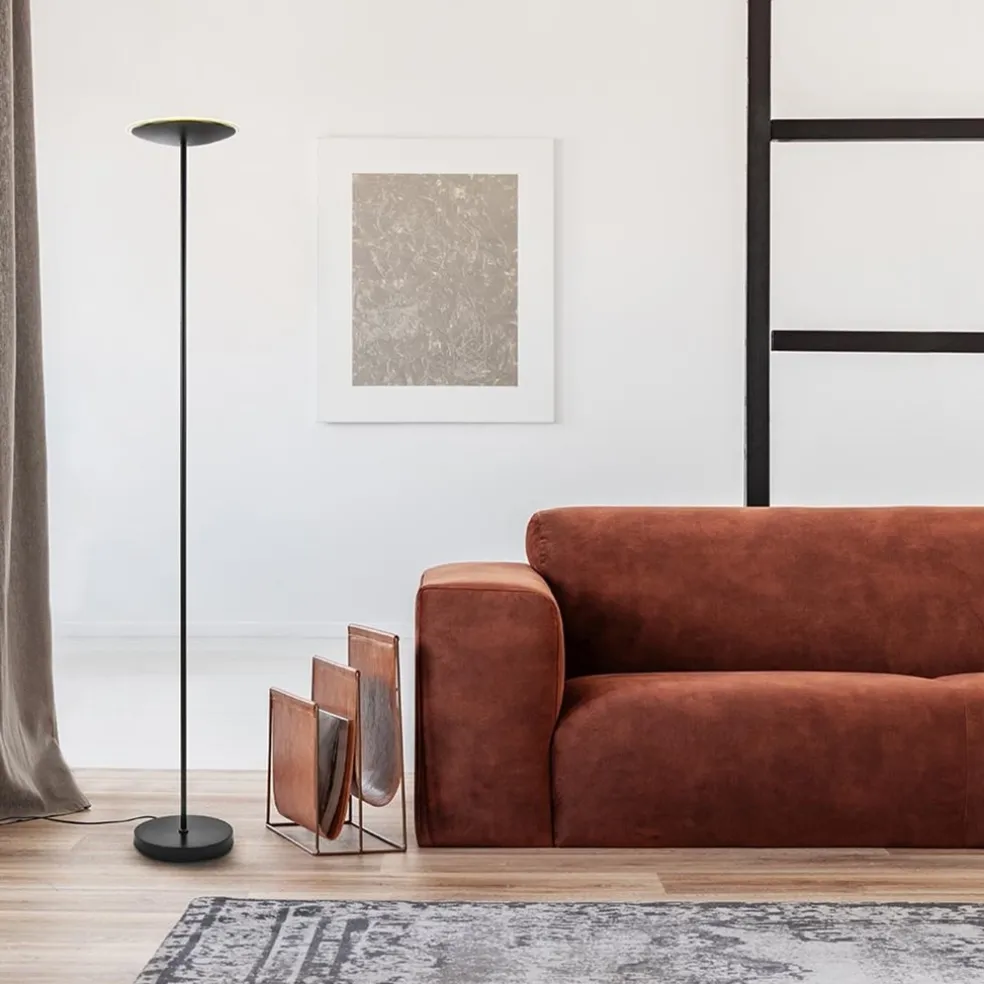 Een minimaal design met een groots effect. De moderne uplighter is gemaakt van metaal en uitgevoerd in het zwart. Met 2150 lumen heeft de staande lamp een flinke lichtopbrengst die dimbaar is dmv de dimmer in het snoer. Creëer dus gemakkelijk en snel de juiste sfeer voor een avondje lezen of borrelen. De schotel is aan de bovenzijde afwerkt met een glasplaat die net iets uitsteekt voor een mooi effect. Doordat de uplighter alleen naar boven verlicht ontstaat er een mooie indirecte verlichting in de ruimte. De LED vloerlamp is voorzien van een zwart snoer van 240 cm met een dimmer op 85 cm.