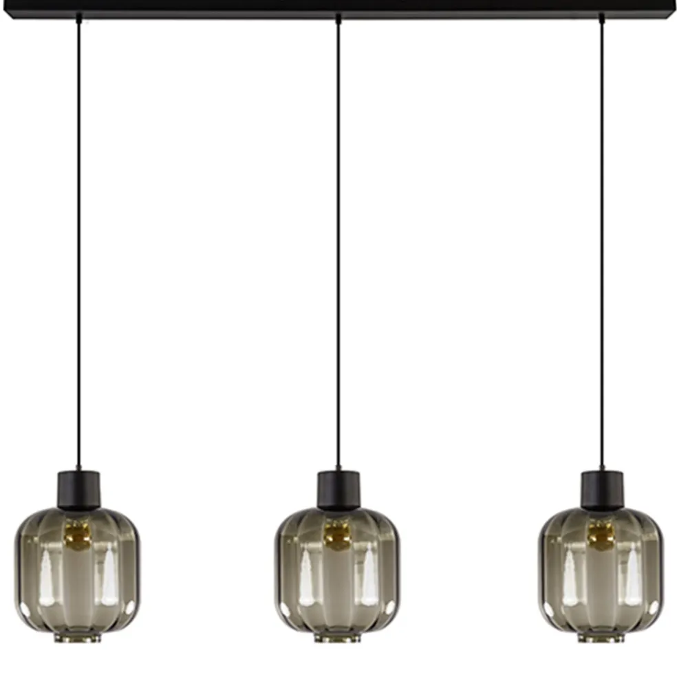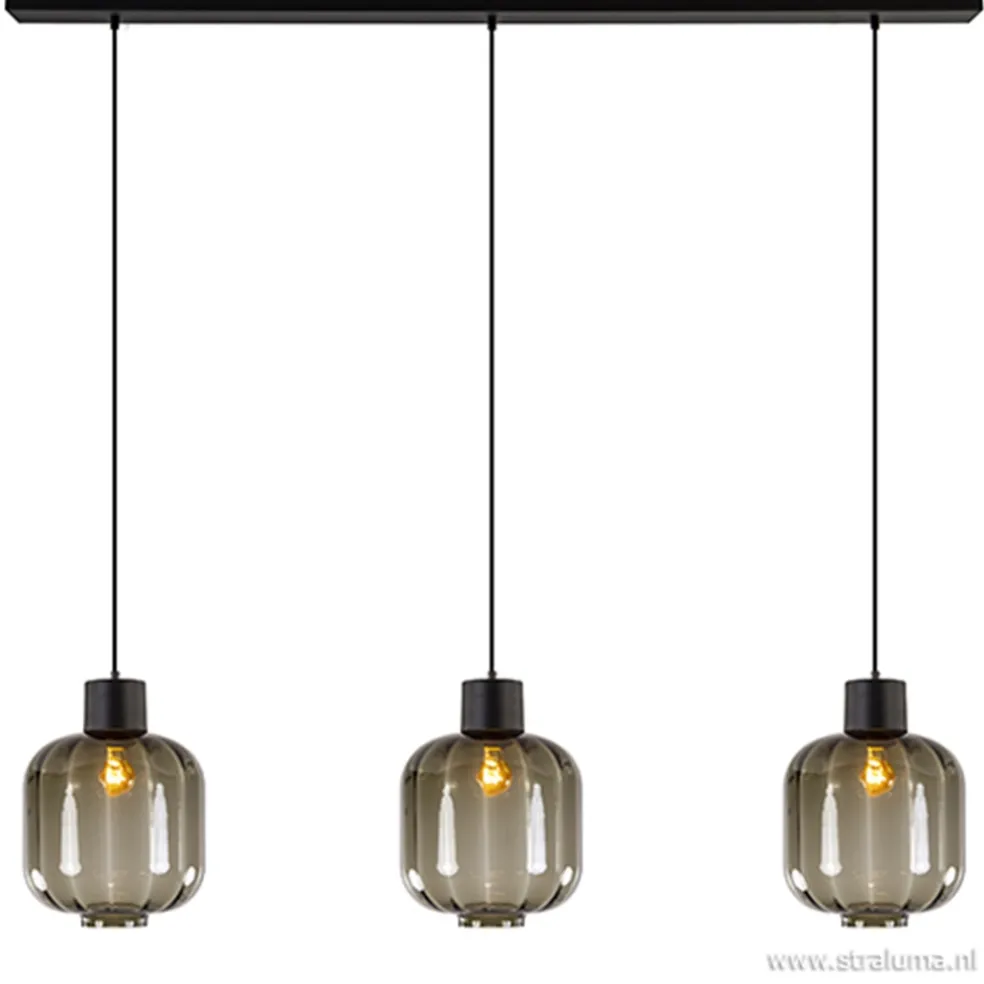 Deze luxe 3-lichts hanglamp is vervaardigd uit mondgeblazen glas uit Italië, wat resulteert in de hoogwaardige glazen kappen. Door het gebruik van grijs-zwart glas krijgt de hanglamp een extra luxe en sfeervolle uitstraling. De glazen kappen lopen over in een mat zwart metalen armatuur en hangen aan een zwart stofomwonden snoer die in hoogte is te verstellen. De luxe glazen hanglamp wordt aan het plafond bevestigd met een mat zwarte balk die het geheel compleet maakt. Deze eettafelhanglamp combineert mooi in een modern of strak-klassieke woonstijl.