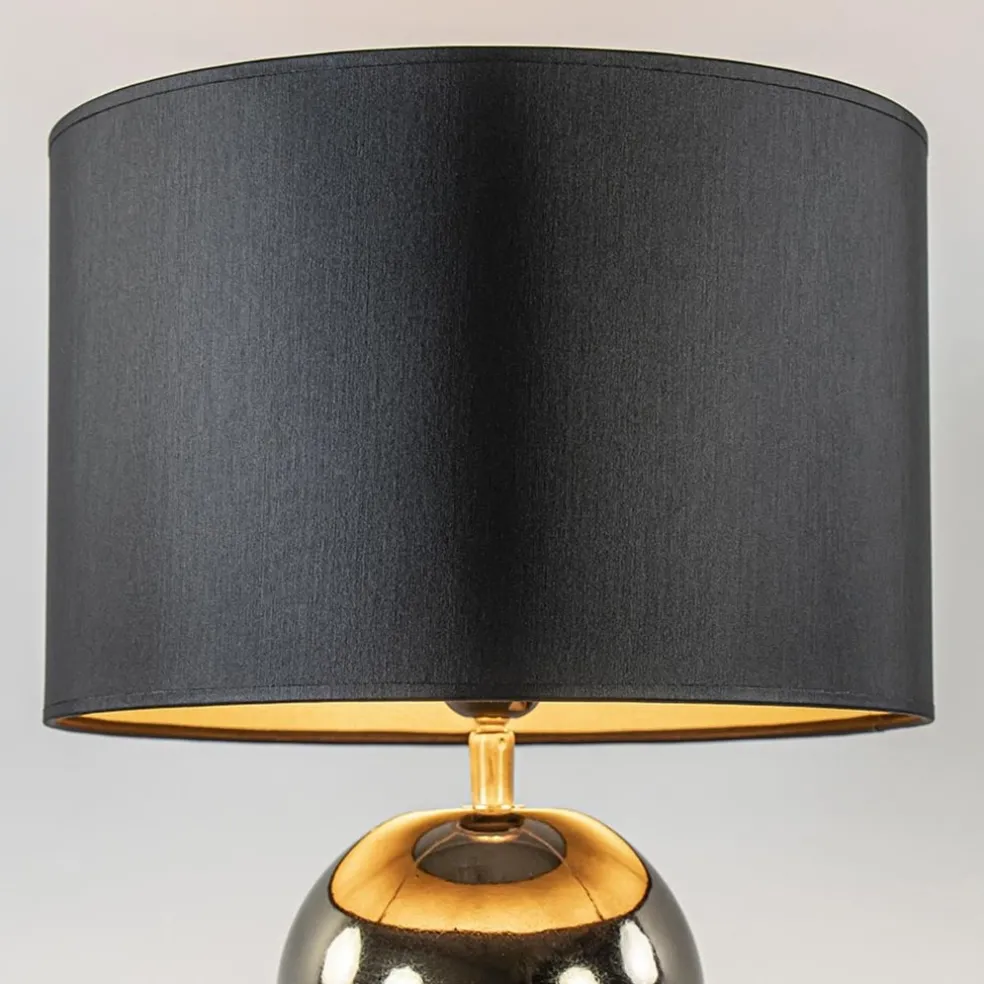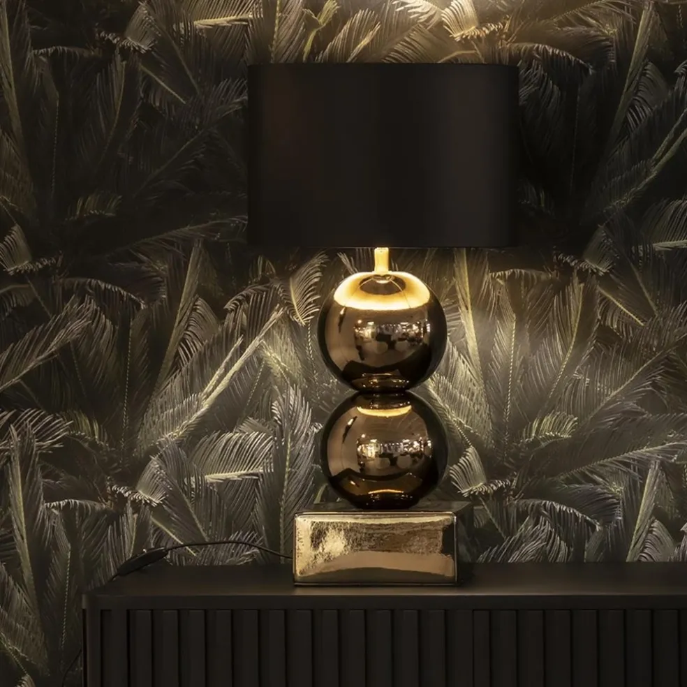 Een elegante toevoeging voor een strak klassiek of hotel chic interieur. De lampvoet is volledig gemaakt van keramiek en is uitgevoerd in het goud. Dit geeft de tafellamp een luxe uitstraling die compleet wordt gemaakt door de ronde kap in het zwart/goud. Deze wordt ondersteund door een fitting met kogelgewricht zodat u de kap gemakkelijk recht kunt zetten. De tafellamp met bollen is voorzien van een zwart snoer met een lengte van 140 cm. De schakelaar bevindt zich op 20 cm van de voet. De chique tafellamp met kap wordt exclusief lichtbron geleverd.