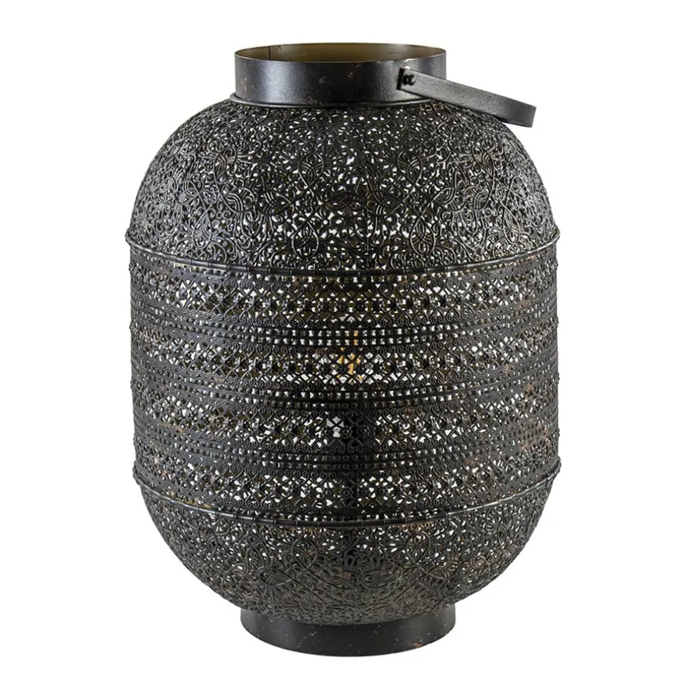 Met deze grote tafellamp creëert u al gauw een Oosterse sfeer in huis. De ronde lantaarn tafellamp is volledig van metaal en voorzien van een decoratief dessin. Het dessin geeft de tafellamp echt die Oosterse uitstraling en zorgt ook voor een mooi effect wanneer de lamp wordt ingeschakeld. De grote lantaarn is uitgevoerd in het donker bruin en voorzien van een antieke afwerking wat de lamp nog meer karakter geeft. Door het formaat past de lamp mooi op een dressoir, maar ook op de grond naast de bank zorgt deze sfeervolle lantaarn voor een leuk effect. Van binnen is de lamp goudkleurig wat zorgt voor een extra warme verlichting en aan de buitenzijde is de lantaarn voorzien van een hengsel wat de lamp helemaal afmaakt. De donker bruine Oosterse tafellamp is voorzien van een zwart snoer van 180 cm, met een knipschakelaar op 35 cm van de lamp, en wordt geleverd zonder lichtbron (E27).