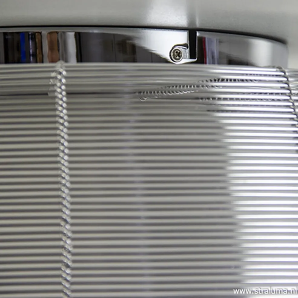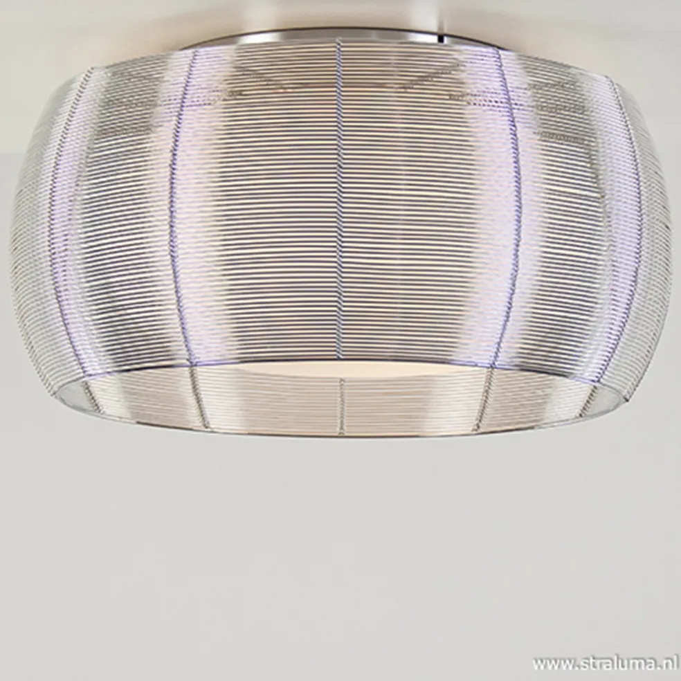Op zoek naar een plafondlamp-plafonnière die mag opvallen? Dan is dit wat u zoekt. De grote ronde kap van 50 cm is gemaakt van een zilveren frame waartussen zilveren ijzerdraden zijn gevlochten. Dit geeft de kap een draadlamp effect. Voordeel van deze lamp is dat deze van binnen is afgewerkt met een mat glazen kap, dit zorgt ervoor dat u niet direct in de lichtbron kijkt en het matte glas zorgt voor een warme en sfeervolle verlichting. De grote plafondlamp wordt met een chromen plafondplaat opgehangen. Door z’n grootte past de lamp mooi in een slaap- of woonkamer.