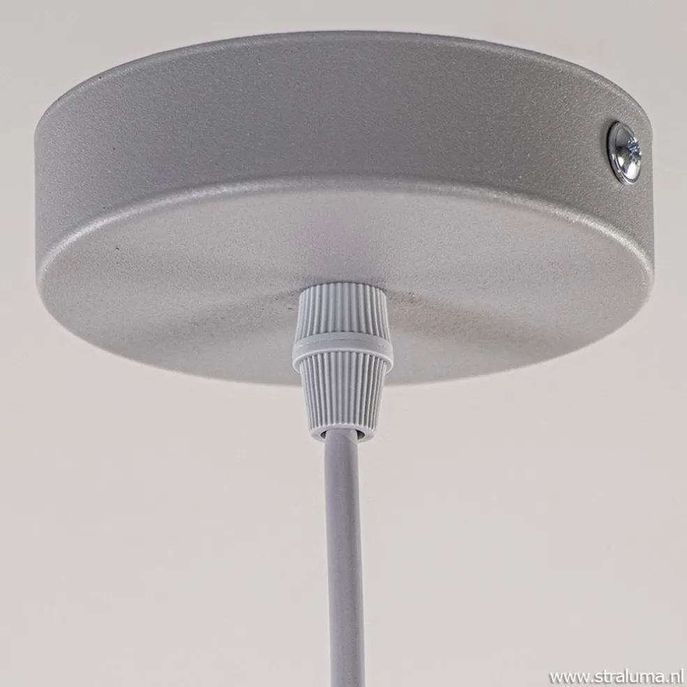 Prima geschikt voor een modern of Scandinavisch interieur. De kap van de moderne hanglamp bestaat uit twee delen, een metalen buitenframe waar een draad overheen gewikkeld is voor een speels effect, en de stoffen binnenkap. De binnenkap zorgt voor een sfeervolle lichtverspreiding en tevens dat er niet direct in de lichtbron kan worden gekeken. De grijze kap hangt aan een grijs snoer die in hoogte is te verstellen en wordt aan het plafond bevestigd met een ronde metalen bevestiging. De lamp leent zich prima voor een ruimte als de woonkamer, slaapkamer, keuken of hal.