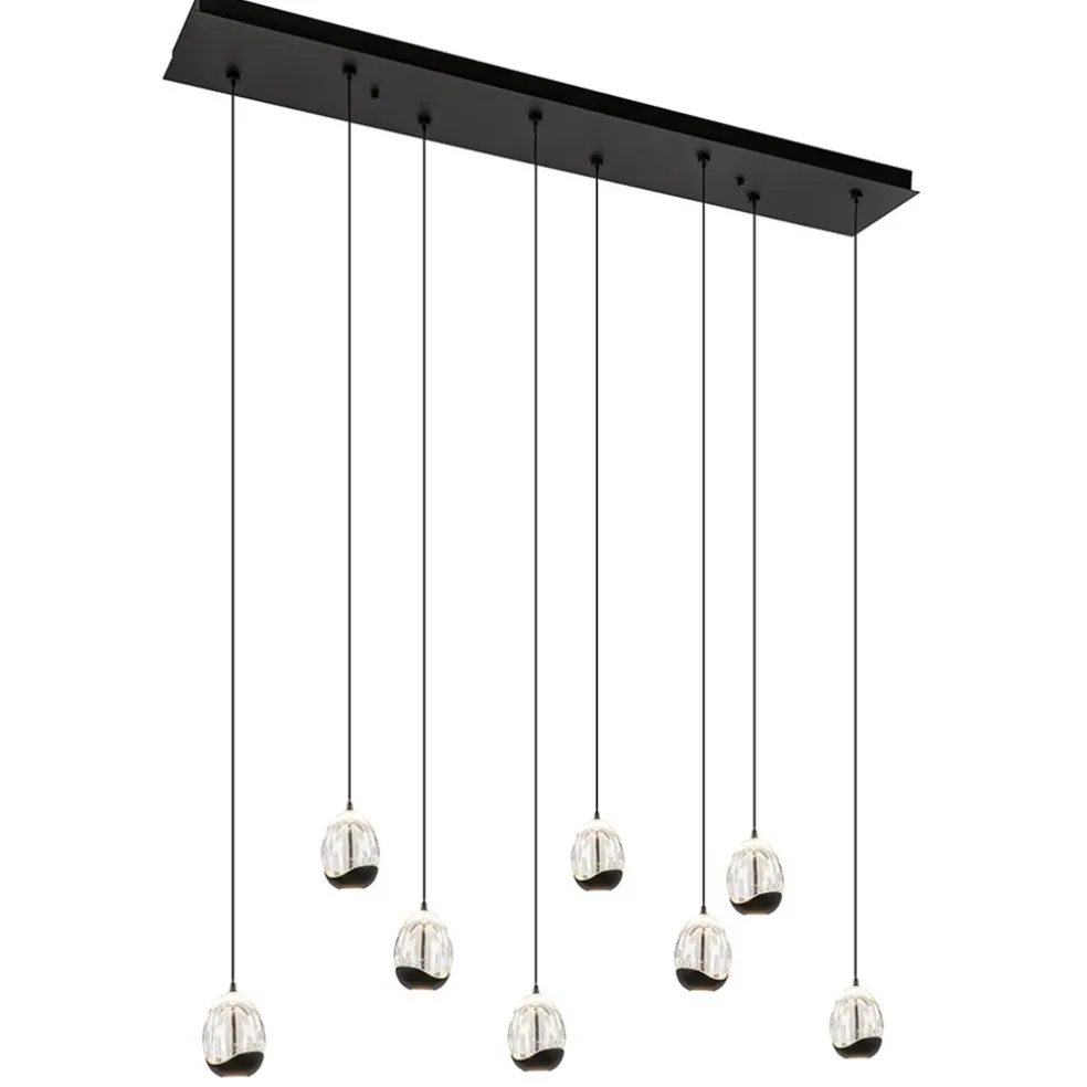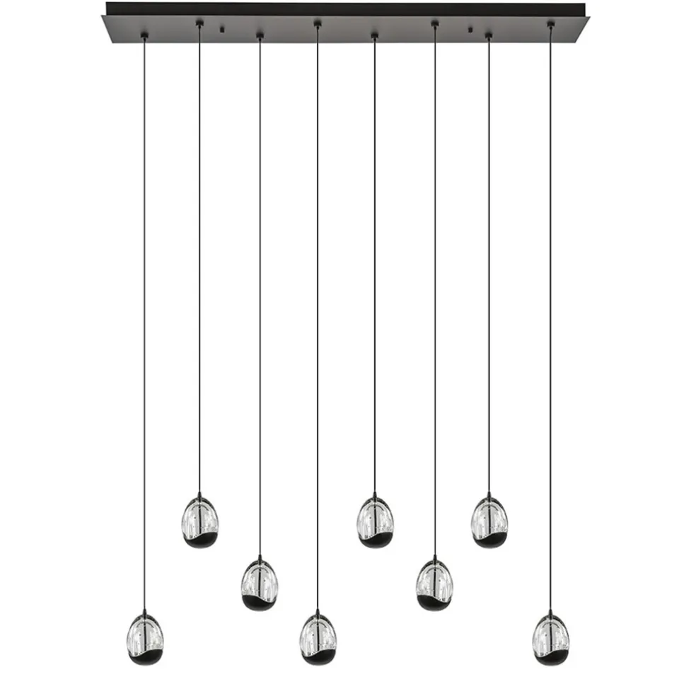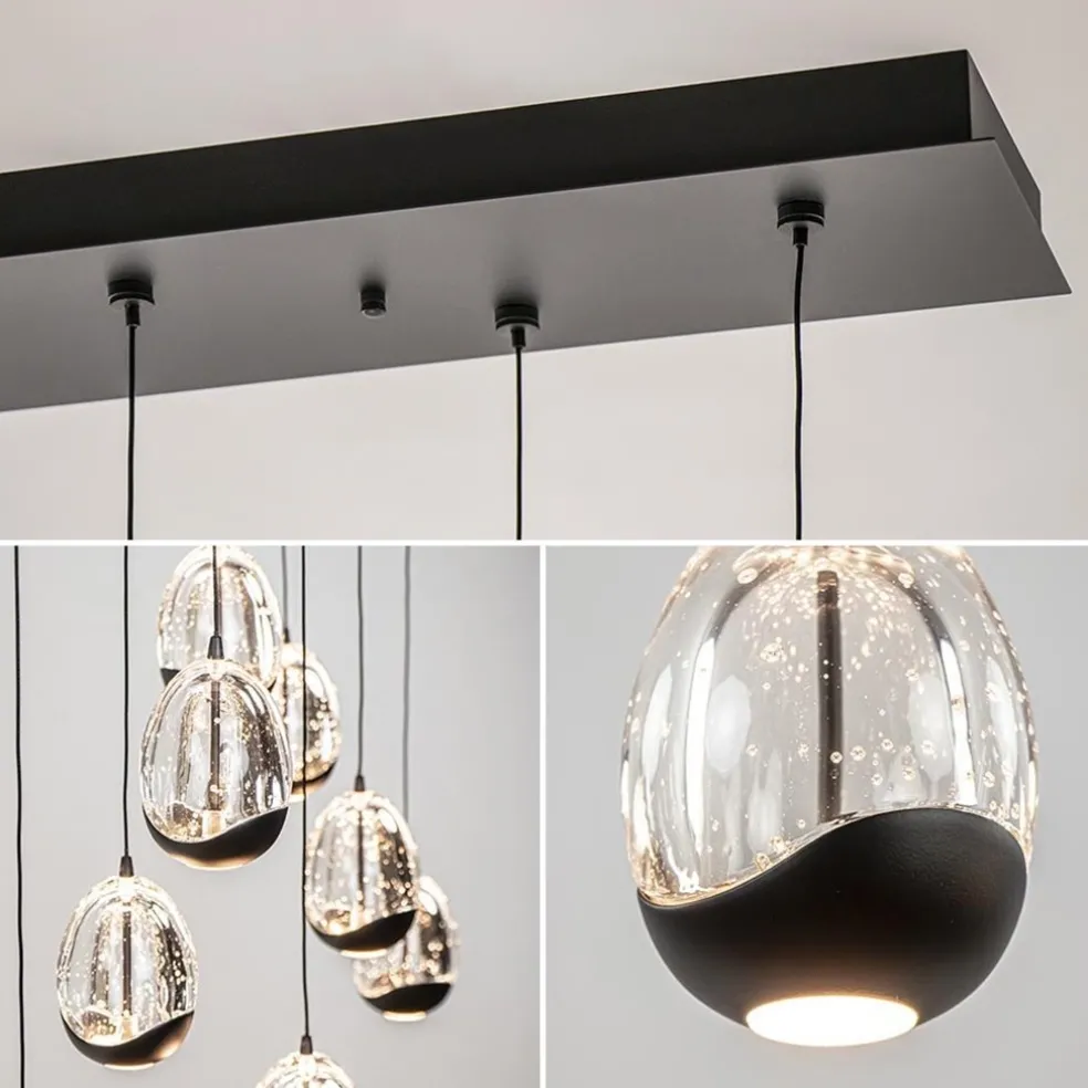 Eieren voor uw geld? Dat kan nu letterlijk met deze moderne hanglamp. De kappen zijn gevormd als een ei en voorzien van LED verlichting. De kap is deels van massief helder glas en deels van metaal dat is uitgevoerd in het mat zwart. Dit geeft de kap een moderne luxe uitstraling. Het glas is voorzien van belletjes wat een mooi effect geeft wanneer de lamp wordt ingeschakeld. De verlichting geeft direct licht naar beneden dmv de spot onderop het ei, en daarnaast ook indirect licht door het licht binnenin het ei. De 8 kappen zijn gemakkelijk naar wens op hoogte te hangen dmv een trekontlaster. De 8-lichts hanglamp wordt opgehangen met een mat zwarte balk van 115 cm.