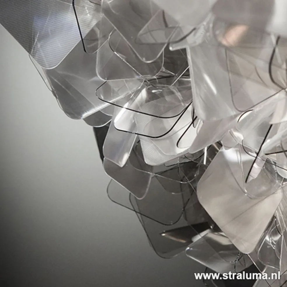 Groter is beter. Dat geldt zeker voor deze prachtige design hanglamp. Een hanglamp als een grote wolk van licht. Hij neemt bezit van de ruimte, en geeft deze een heel nieuw karakter. De elementen lijken volledig willekeurig samegesteld, maar volgen een zeer precieze compositie. Deze design lamp heeft een mooie balans van transparant en semi-transparant. De grote hanglamp hangt met een transparant snoer en 3 staalkabels aan de witte plafondbevestiging. De lamp heeft een prachtige rookkleur.