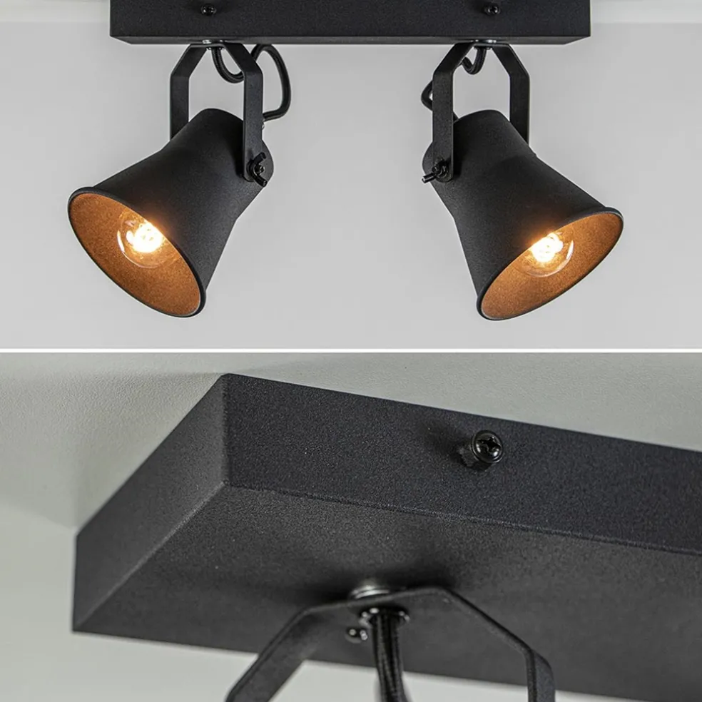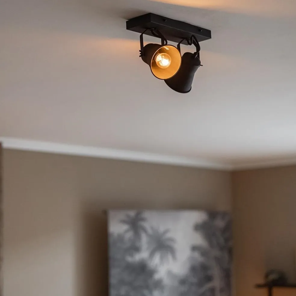 Een stoere 2-lichts plafondlamp. De plafondlamp is volledig van metaal en afgewerkt met een mat zwarte finish. Het matte zwart zorgt voor een stoere industriële look, maar tegelijkertijd ook voor een moderne Scandinavische uitstraling. De twee spots zijn los van elkaar te verstellen door deze te draaien en te kantelen. Ideaal wanneer u een hal of slaapkamer wilt uitlichten of de lamp als extra sfeerlicht wilt toepassen in een woonkamer. Deze 2-lichts plafondlamp is een ideale toevoeging aan het interieur en past gemakkelijk in diverse woonstijlen. De plafondlamp wordt geleverd zonder lichtbronnen (2x E14).