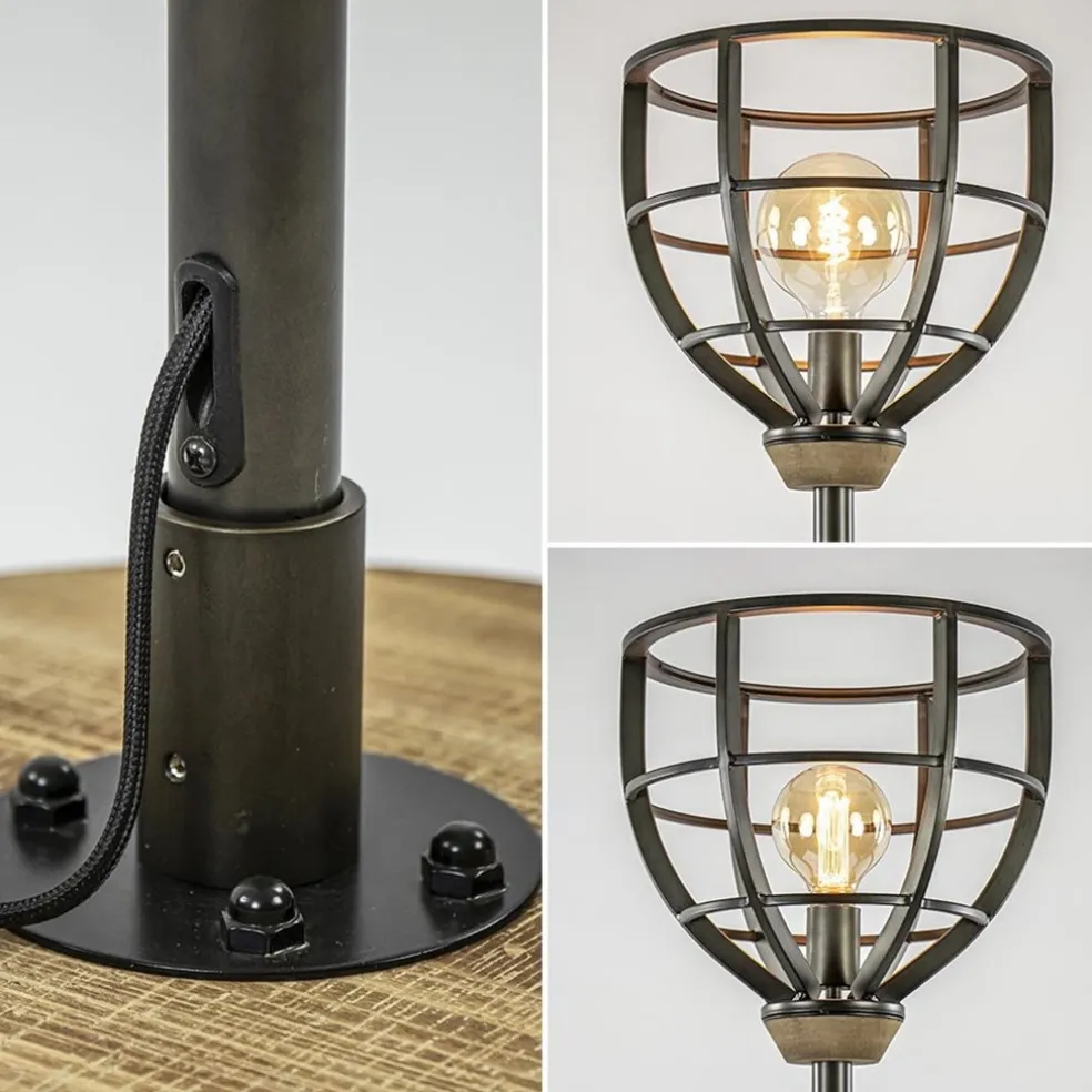Stoer, industrieel en landelijk in één. De vloerlamp is gemaakt van metaal en voorzien van houten details. Het metaal heeft een robuuste look, net als het hout. De ronde voet is van hout en ondersteund het metalen armatuur. De kap is een metalen kooi met een grove afwerking zoals de zichtbare lasnaden. De staande lamp is voorzien van een zwart stof omwonden snoer met een lengte van 240 cm. De voetschakalaar bevindt zich op 140 cm in het snoer. De zwart stalen vloerlamp is een mooie toevoeging voor een woonkamer of slaapkamer.