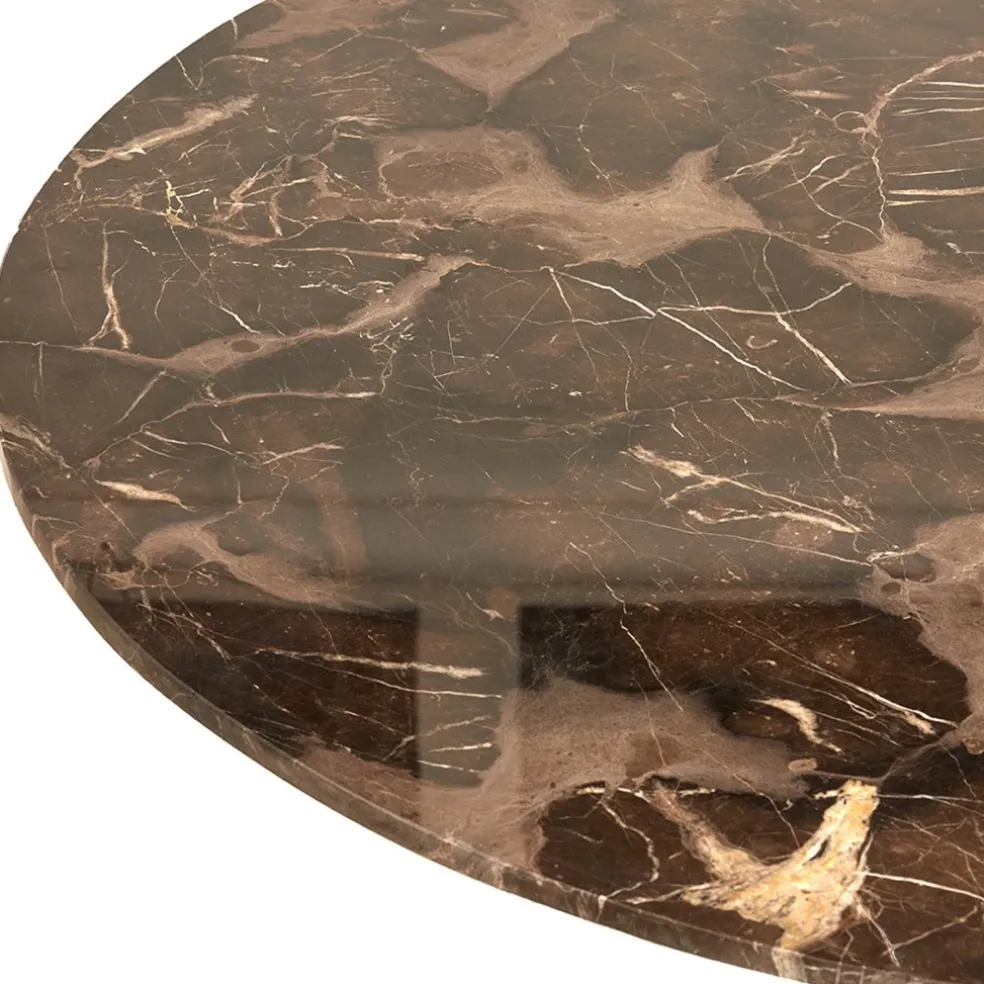 Deze prachtige eettafel straalt een en al luxe uit. De ronde tafel heeft een doorsnede van 120 cm en is 78 cm hoog. Het blad is gemaakt van marmer en is in het bruin uitgevoerd. Het ronde blad wordt door een stevige metalen poot ondersteund die ook in het bruin is uitgevoerd. De combinatie maakt de tafel prima geschikt voor diverse woonstijlen. De ronde marmeren eettafel biedt genoeg ruimte voor 4 tot 5 stoelen om heerlijk te dineren of borrelen. Marmer is een natuursteen waardoor ieder blad een andere look heeft.