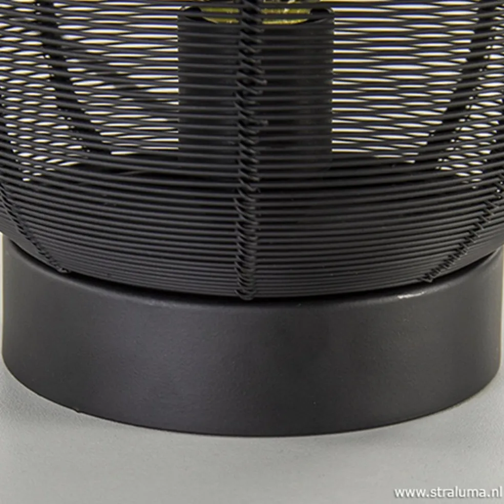 Klein maar wel stoer deze draad tafellamp. De zwarte tafellamp is gemaakt met een metalen frame waartussen de metaaldraden zijn gevlochten. Het leuke aan de kap is dat deze volledig dicht is, vaak zijn draadlampen deels open. De lamp gaat open door de schroeven in de metalen voet los te draaien en zo de lichtbron te verwisselen. Dit mat zwarte tafellampje past mooi op een dressoir of in een kast bij diverse woonstijlen als landelijk, industrieel of modern.