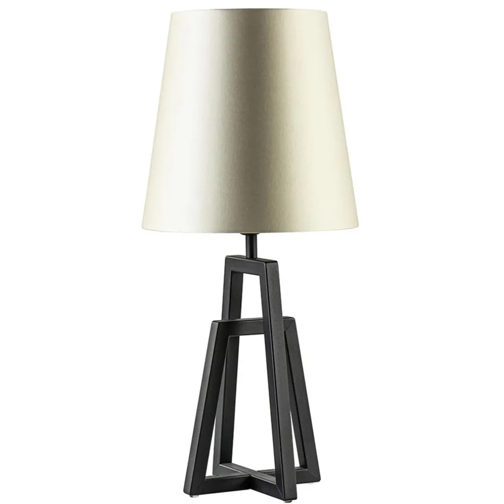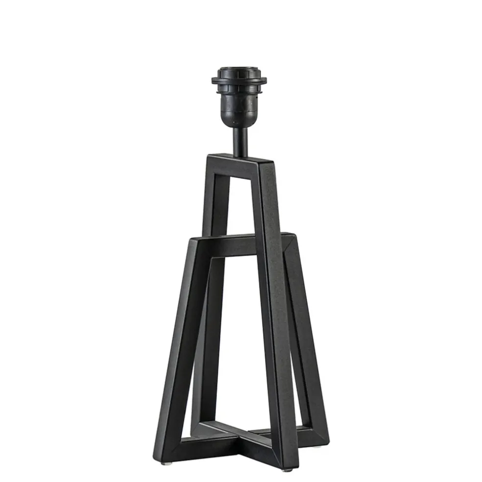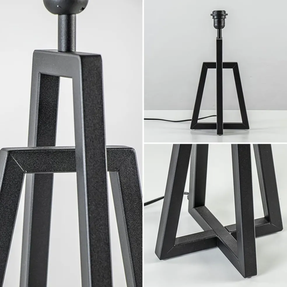 Moderne stoere tafellamp. Deze stoere tafellamp bestaat uit twee delen die speels door elkaar heen lopen. Het mat zwarte metaal geeft de tafellamp een stoer uiterlijk. U maakt de tafellamp naar eigen smaak met een door u uitgekozen kap. De tafellamp past mooi op een dressoir, nachtkastje of bijzettafel. Het armatuur heeft een snoer van 165 CM, de schakelaar bevindt zich op 40 CM van het armatuur. Deze tafellamp wordt exclusief lichtbron en kap geleverd.