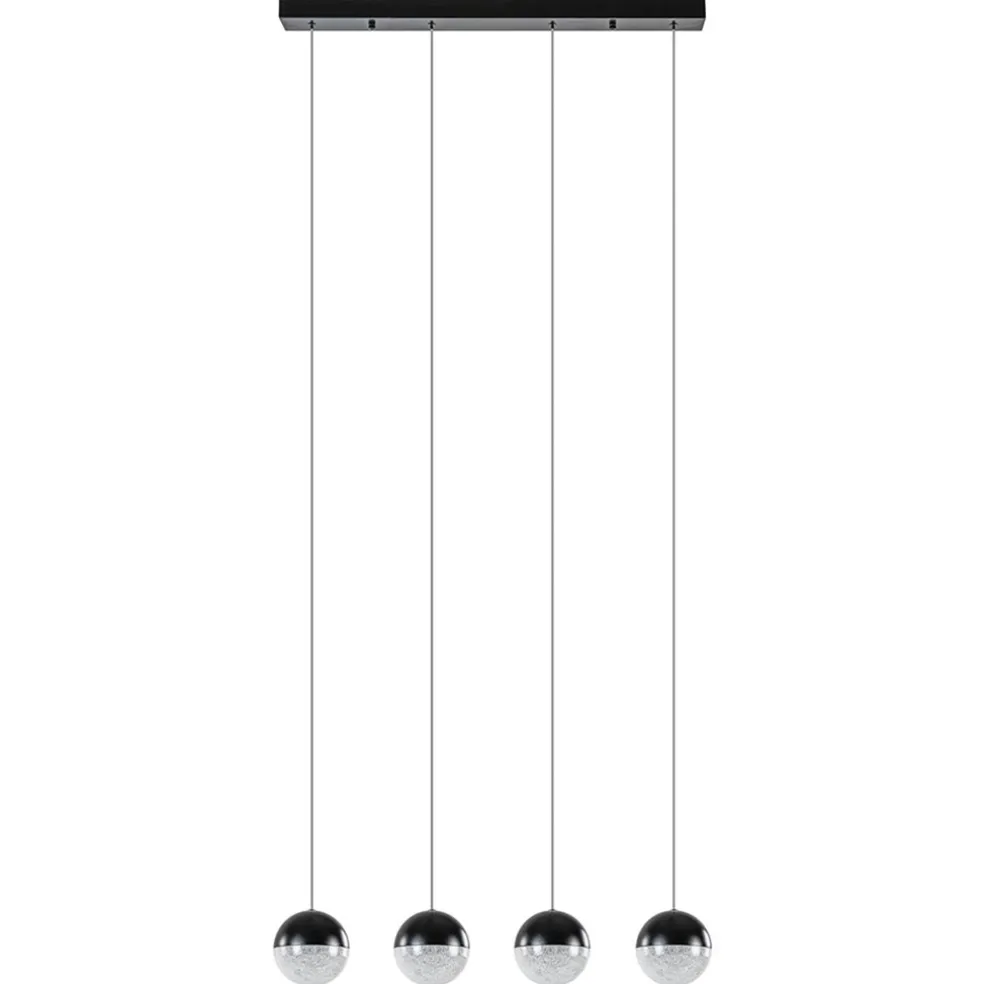 Een leuke moderne hanglamp met een sfeervol effect. Deze 4-lichts hanglamp zwart is gecombineerd met diamant zand wat voor een sfeervolle verlichting zorgt. Ideaal aan de LED-hanglamp is ook dat deze is voorzien van een 3-standen functie. Dit houdt in dat u de lamp gemakkelijk kunt dimmen d.m.v uw wandschakelaar. Er is dus geen externe dimmer nodig. Met een druk op de knop schakelt u snel tussen de 3 scènes en creëert u gemakkelijk de gewenste sfeer. Ideaal tijdens het dineren en natafelen. De vier bollen zijn half zwart en half diamant zand wat mooi is verwerkt in een kunststof kap. De LED bollen hangen aan soepele draden die naar wens zijn in te korten en de 4-lichts LED hanglamp wordt met een zwarte plafondbalk opgehangen.