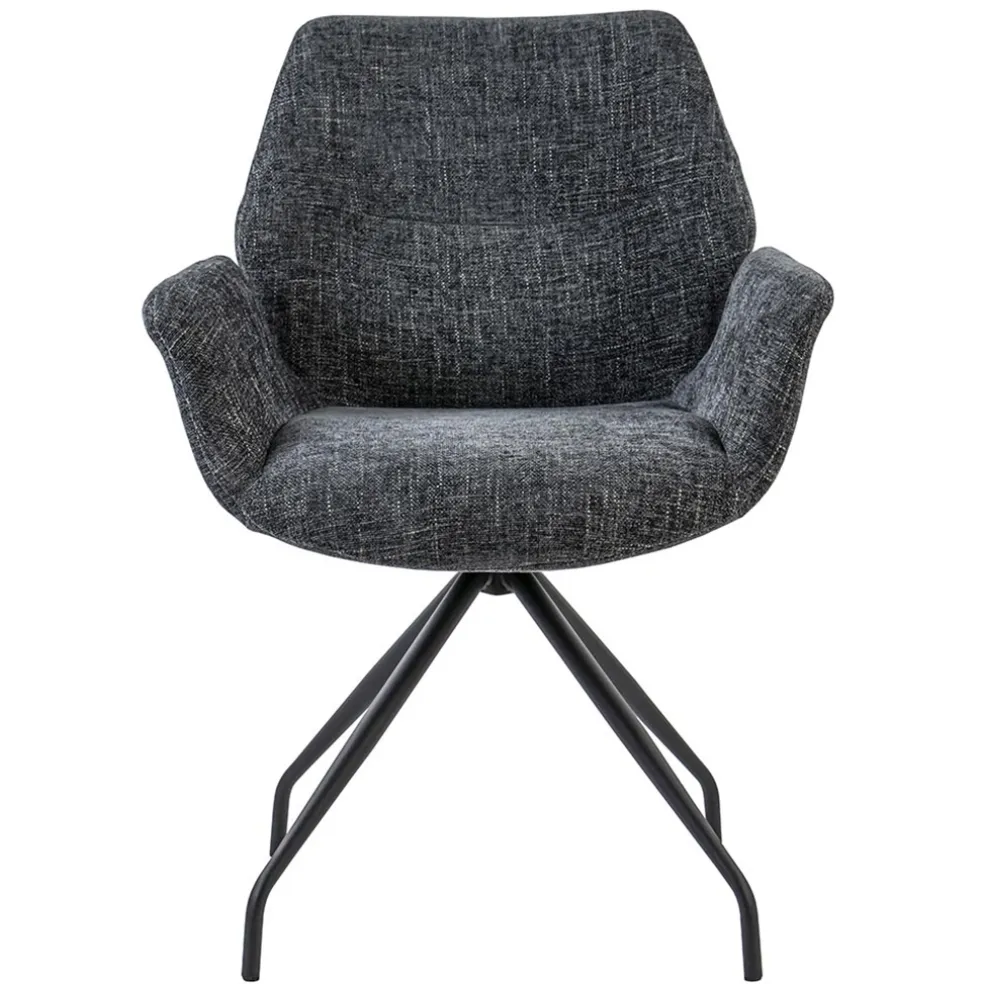 Dineren is nog nooit zo fijn geweest als met deze armstoel. De stoffen zitting zorgt voor een fijn comfort en doordat deze draaibaar is kunt u gemakkelijk gaan zitten of opstaan. Daarnaast is de eetkamerstoel voorzien van een return-system waarmee de stoel automatisch weer recht draait. De stoffen zitting van de stoel is uitgevoerd in het donker grijs gemeleerd en de metalen spider poot is voorzien van een mat zwarte finish.