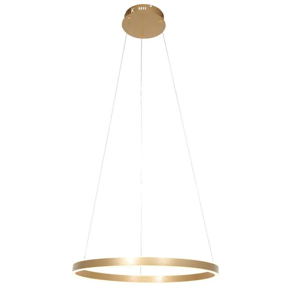 Een modern en strak design met een chic randje. Deze goudkleurige hanglamp bestaat uit een ring die gesierd wordt door twee LED ringen, zowel onder als boven. Dit zorgt voor een mooi diffuus licht. Ideaal voor in de woonkamer of eetkamer. De ring hangt aan drie smalle draden die naar wens zijn in te korten. De maximale hoogte van de lamp is 170 cm. De hanglamp kan gedimd worden met de juiste LED dimmer. Neem contact op met de klantenservice voor advies indien u de lamp wilt dimmen.
