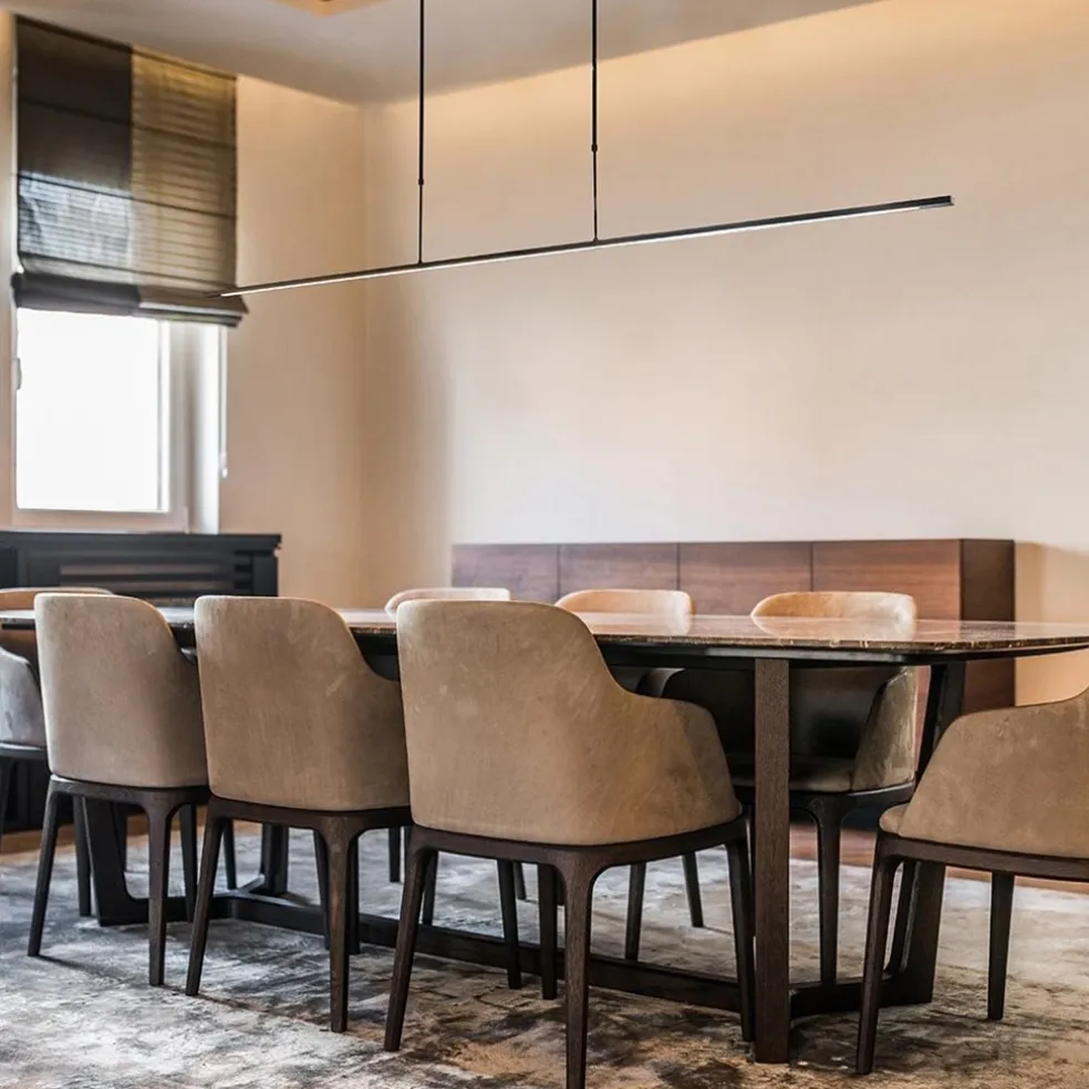 Deze prachtige hanglamp is een mooie toevoeging voor de eetkamer of het kantoor. De lamp heeft een strak en slank design dat mooi past in diverse woonstijlen, van strak klassiek, luxury tot modern. De hanglamp is vervaardigd uit aluminium en uitgevoerd in het mat zwart. De langwerpige balk is voorzien van LED verlichting aan de onderzijde wat door middel van de dimmer op het armatuur dimbaar is. De dim to warm functie zorgt voor extra sfeer tijdens het natafelen en borrelen. Het mat zwarte armatuur is in hoogte te verstellen tussen de 75 en 145 cm.