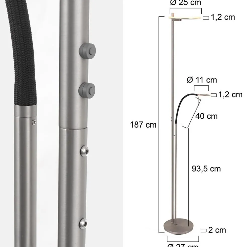 Deze prachtige vloerlamp maakt het interieur helemaal af. Mooi van design en ook nog eens zeer functioneel. De vloerlamp is uitgevoerd in het staal met helder glas en voorzien van LED verlichting. Dit is terug te vinden in de uplighter en de verstelbare leesarm. Door middel van de dimmers op het armatuur kunt u ook gemakkelijk de gewenste sfeer creëren. Zo kunt u beide lampen apart bedienen en deze dimmen in kleur en intensiteit. Ideaal voor een gezellige avond borrelen of voor het lezen van een boek. De leesarm is afgewerkt met een zwart stoffen arm wat de lamp een stoere look geeft. De moderne uplighter met leesarm heeft een zwart snoer met een lengte van 180 cm.