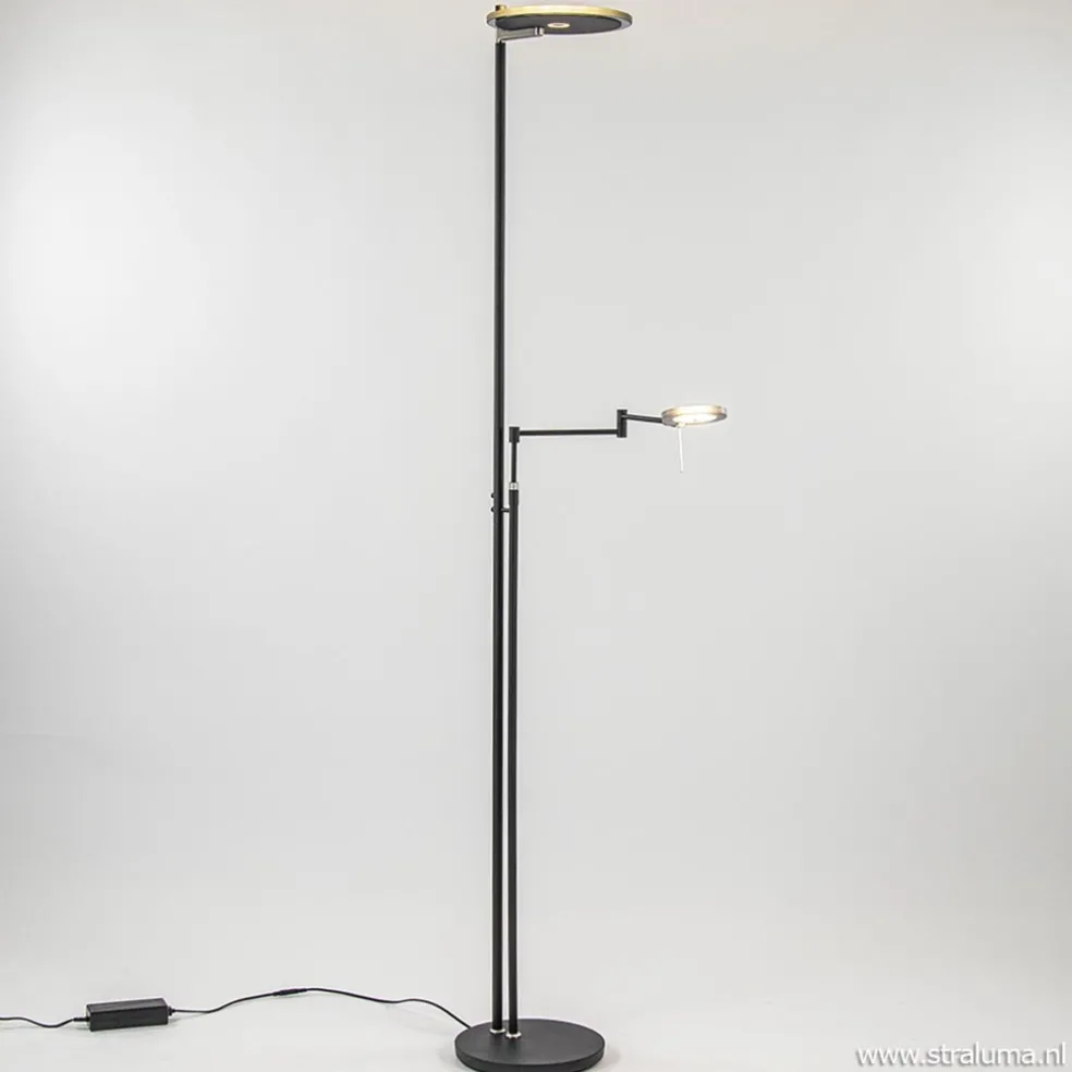 Een mooie luxe versie van een klassieke uplighter. De moderne vloerlamp is vervaardigd uit metaal en afgewerkt met een mat zwarte finish. Het zwart is mooi gecombineerd met smoke glas, waardoor de lamp een extra luxe uitstraling krijgt. Naast de mooie uitstraling is de lamp ook zeer functioneel. Zo kunt u de leesarm in hoogte en lengte verstellen en is de kap te draaien en te kantelen zodat u deze gemakkelijk naar de juiste richting kunt plaatsen. De uplighter en de leeslamp zijn los van elkaar te bedienen en te dimmen d.m.v de twee dimmers midden op het armatuur. Één keer drukken en de lamp gaat aan, houdt u de dimmer langer ingedrukt dan dimt deze totdat u weer loslaat. De moderne vloerlamp is volledig voorzien van LED en geeft een sfeervolle warm witte verlichting. De uplighter met leeslamp heeft een zwart snoer van 235 cm.