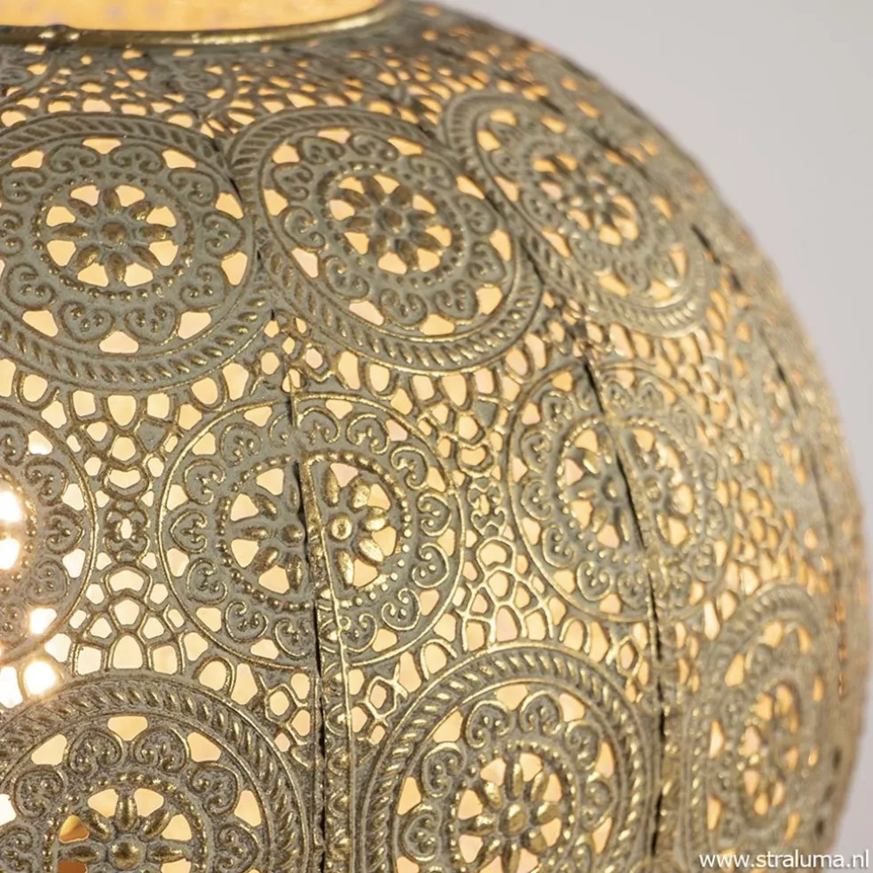 Invloeden van over de hele wereld vinden we terug in de trend werelds wonen. Deze invloeden zijn ook terug te vinden in deze kleine tafellamp. De ronde kap is voorzien van een decoratief dessin wat doet denken aan de oosterse lantaarns. De metalen tafellamp heeft een antieke messing afwerking wat een verweerde look geeft, iets dat mooi past binnen de wereldse trend. Dit is ook vooral goed te zien in de voet van de messing tafellamp. De oosterse lamp is voorzien van een zwart snoer van 190 cm met een schakelaar op 35 cm van de lamp en wordt geleverd zonder lichtbron (E27).