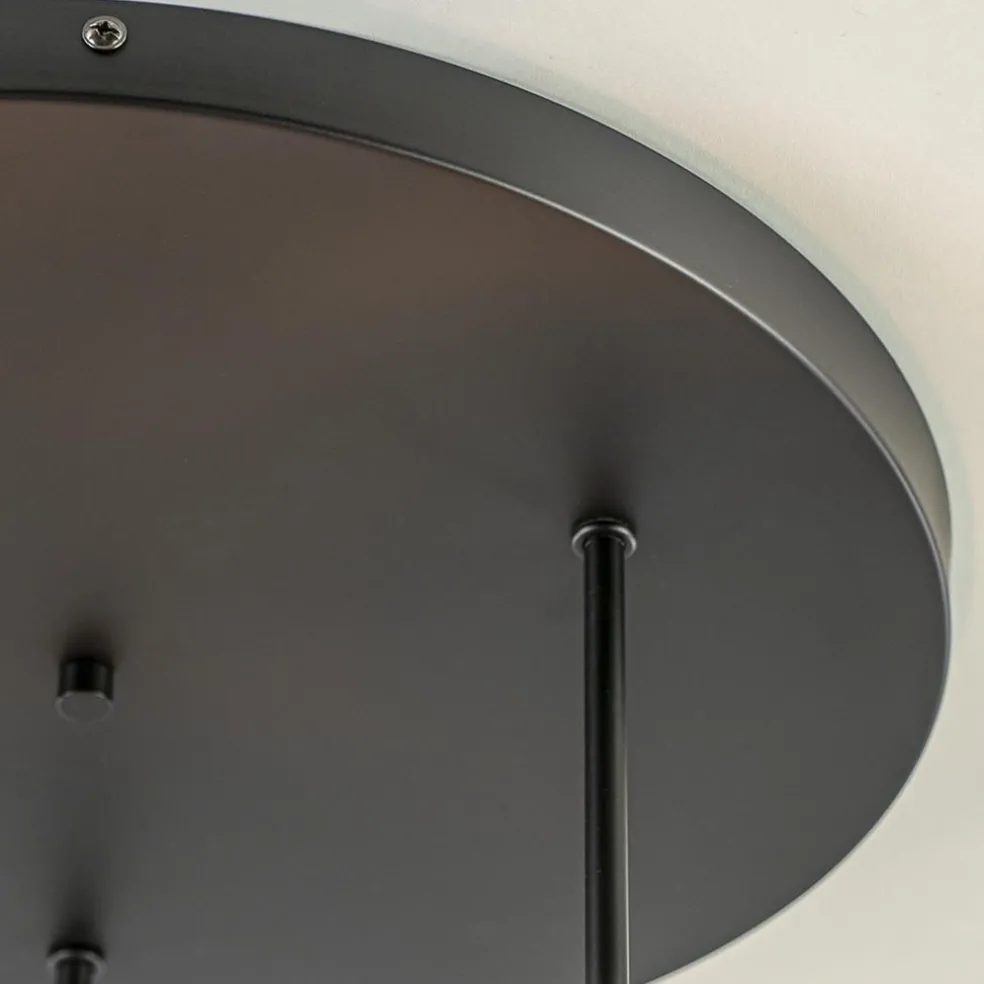 Een grove plafondplaat voorzien van E27 fittingen. U kunt zelf de sfeer bepalen van de lamp door de keuze van de lichtbronnen. Deze worden op diverse hoogtes in de fittingen geplaatst. De plaat heeft een doorsnede van 44 cm en de hoogte van de plafondlamp is 35,5 cm. Mooi voor in de hal, woonkamer of slaapkamer. De lichtbronnen zijn exclusief. De mat zwarte plafondlamp is dimbaar dmv een externe dimmer.
