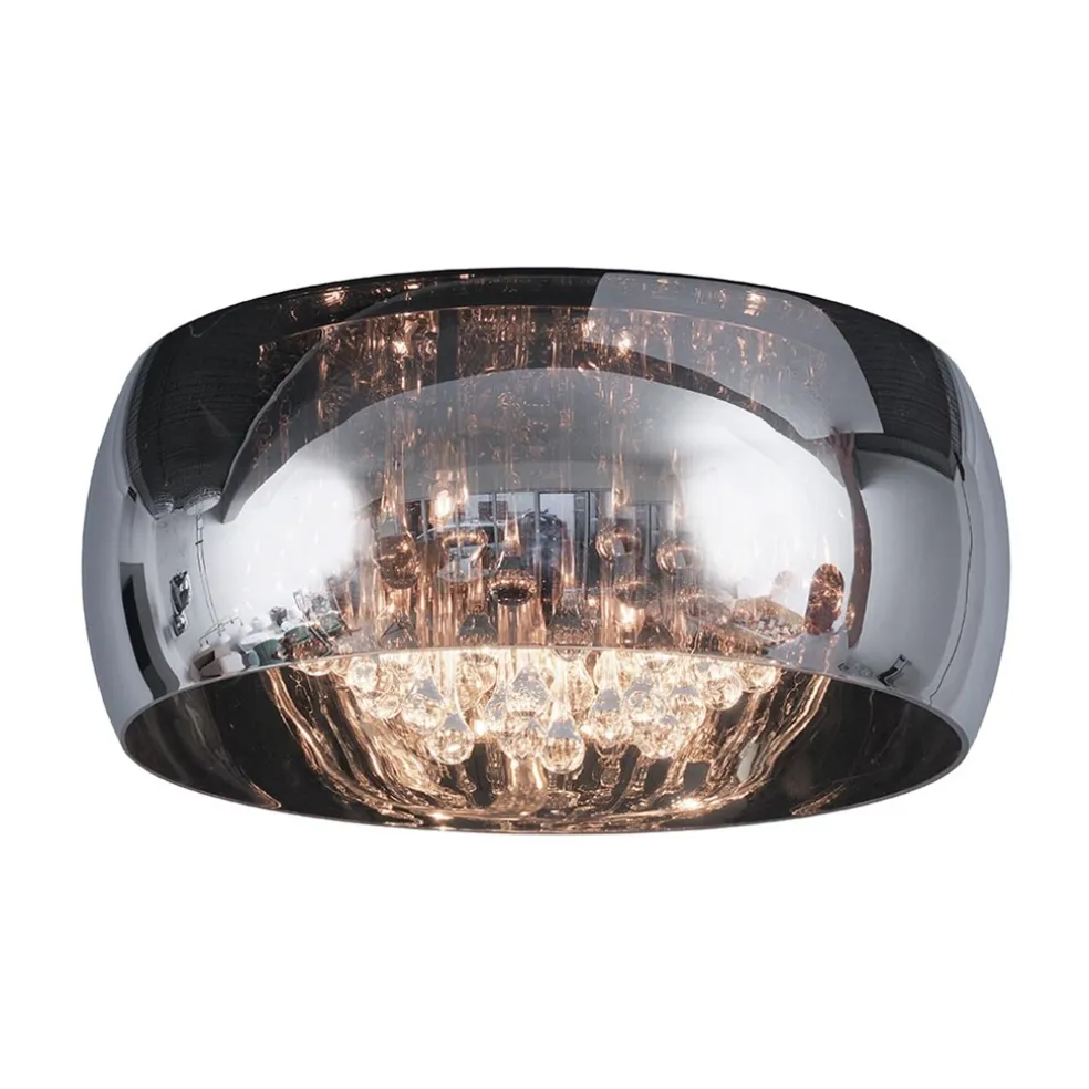 De letterlijk en figuurlijk schitterende plafonnière-plafondlamp Pearl wordt met zijn mond geblazen glazen kap van Ø50 cm nog echt ambachtelijk vervaardigd. De kap is het best te omschrijven als zijnde gemaakt van semi transparant rookglas. Door deze combinatie van spiegeling en transparantie heeft de Pearl een zeer luxueuze en warme uitstraling. De transparante glaspegels aan de binnenzijde van de glazen lampenkap maken het geheel af.