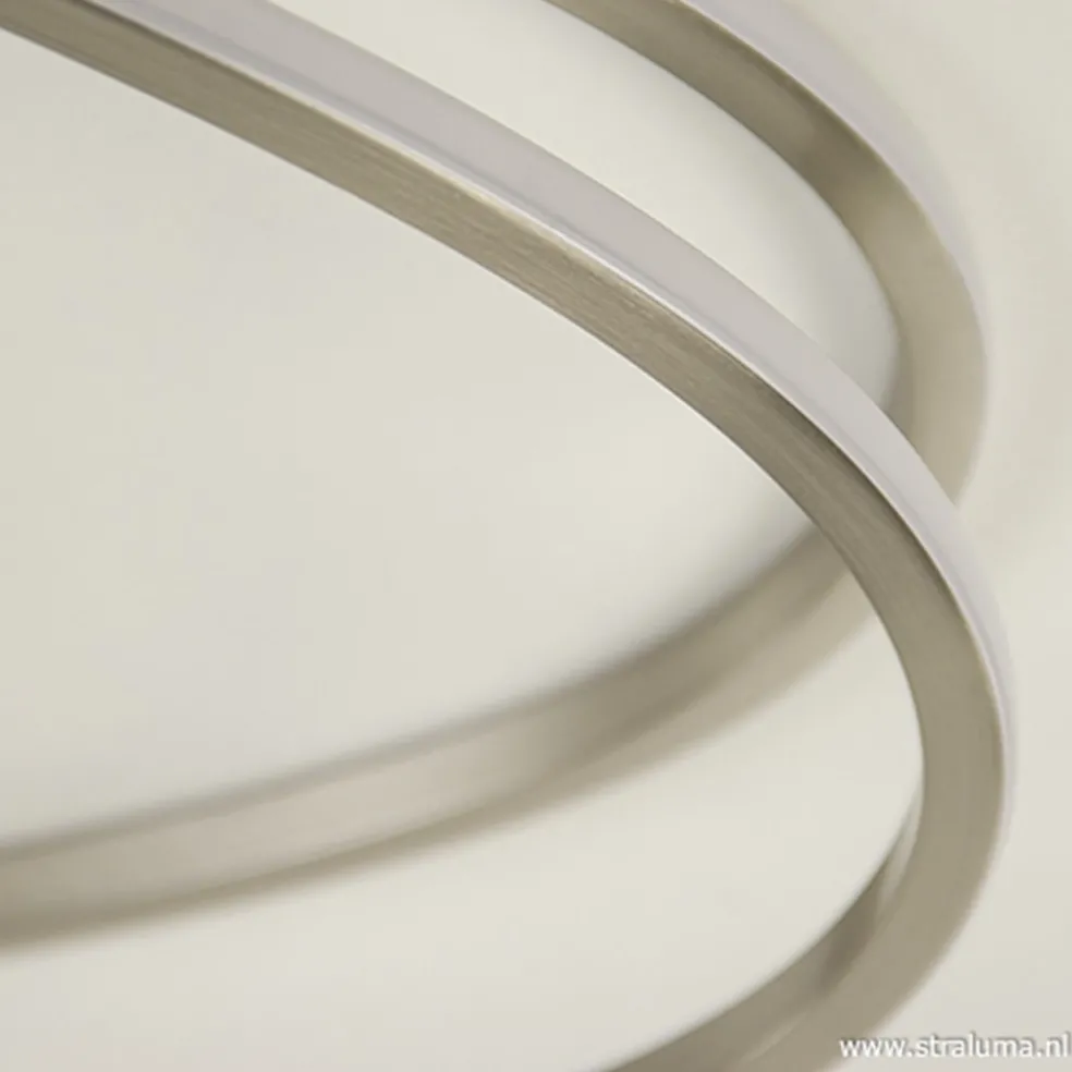 Een moderne LED plafonnière uitgevoerd in staal. De plafonnière bestaat uit twee ringen waar de LED verlichting in is verwerkt. De ringen kruisen elkaar wat een speels effect geeft en het licht mooi verdeeld. De ringen zijn bevestigd aan de ronde stalen plafondbevestiging. De plafonnière geeft een strakke en moderne design look aan het interieur.