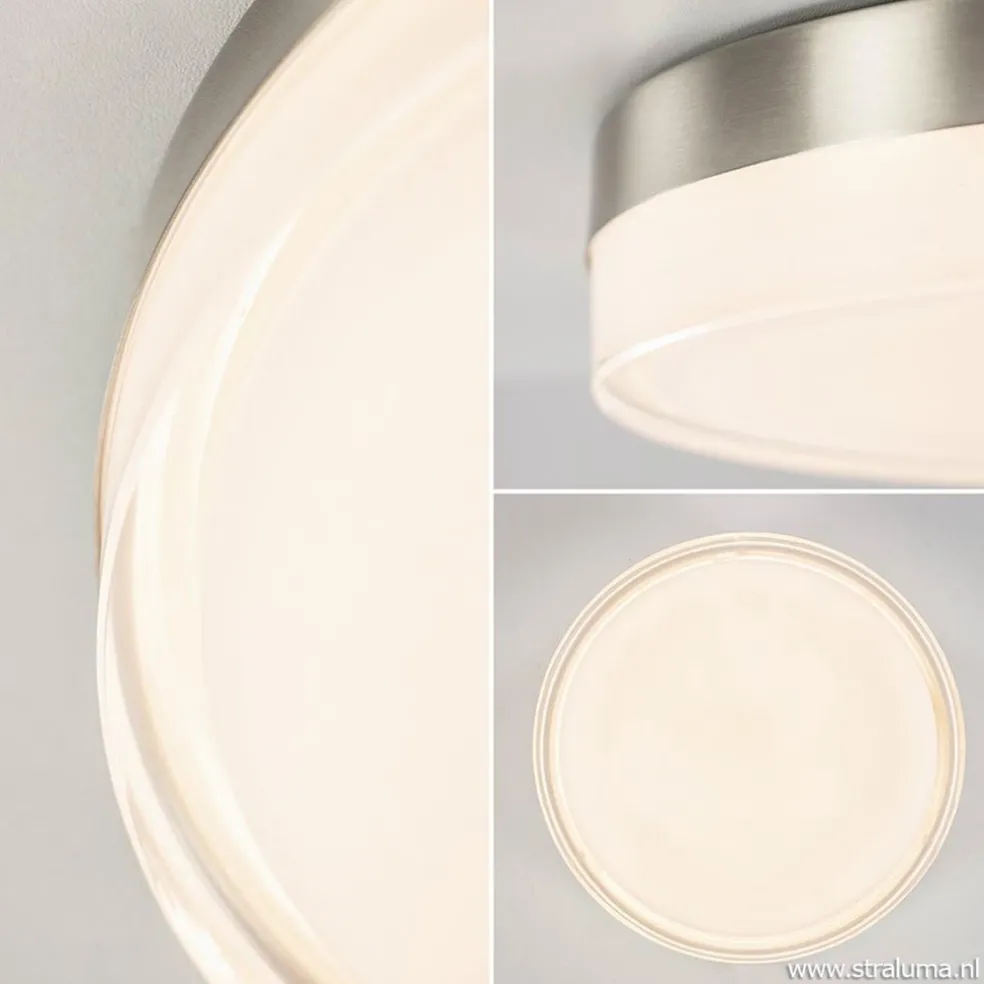 Een strakke moderne versie van de klassieke plafonnière. De plafondlamp bestaat uit een matte nikkel metalen bevestiging en een glazen kap. De bevestiging is voorzien van LED waardoor de lamp energiezuinig is, en het LED is ook nog eens dimbaar in 3 standen. Dit werkt gemakkelijk via de wandschakelaar zodat een extra dimmer niet nodig is, ideaal dus. De kap is gemaakt van opaal glas wat een zachte en sfeervolle verlichting creëert. Voordeel van het glas is ook dat u niet direct in de lichtbron kijkt. De moderne plafondlamp is IP44 goedgekeurd zodat deze toepasbaar is in de badkamer, maar kan ook prima hangen in een slaap- of woonkamer.