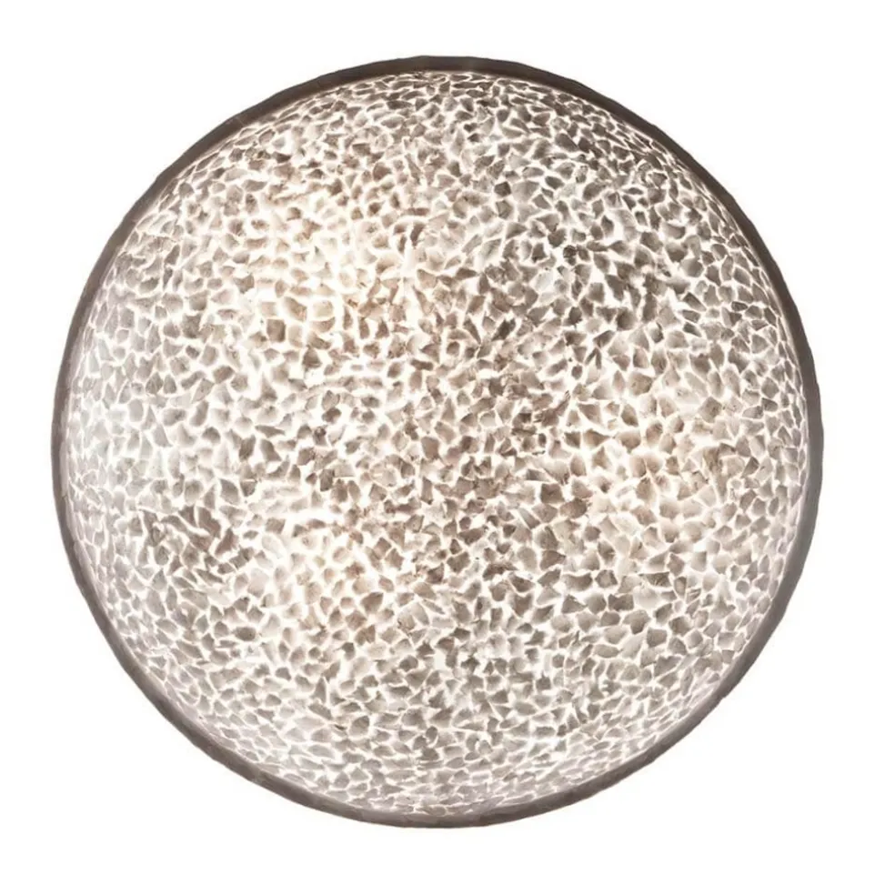 Een mooie decoratieve toevoeging aan het interieur. Deze grote wandlamp is een echte eye-catcher en sfeermaker ineen. De grote kap is gemaakt van gebroken stukjes capiz schelpen die in een fiberglas mal zijn gelegd. De schelpen zorgen voor een sfeervol effect wanneer de lamp is ingeschakeld. Door de witte/parelmoer schelpen krijgt de wandlamp een frisse moderne uitstraling. De schelpen kap is bevestigd op een wit metalen frame waarmee u de lamp gemakkelijk op een schroef of spijker kunt ophangen. Het witte frame zorgt ervoor dat de kap zo’n 5 cm van de muur af staat zodat er langs de muur een mooie lichtverspreiding plaats kan vinden. De grote wandlamp is voorzien van een wit snoer van 170 cm, met een schakelaar op 55 cm van de lamp. De schelpen wandlamp wordt geleverd zonder lichtbron (2x E14).