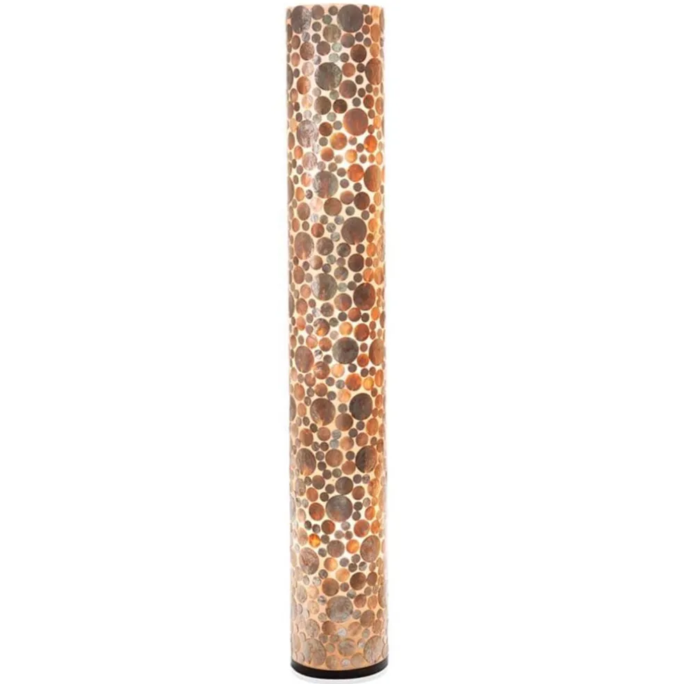 Deze sfeervolle vloerlamp brengt je meteen naar het strand. De staande lamp is gemaakt van Capiz schelpen die in verschillende groottes zijn verwerkt. De schelpenlamp heeft een mooie gouden kleur zodra deze uitstaat maar wanneer de lamp wordt aangezet geven de schelpen een silouet en creërt de lamp een warme en sfeervolle verlichting. De vloerlamp staat op een zwarte voet en heeft een zwart snoer met schakelaar.