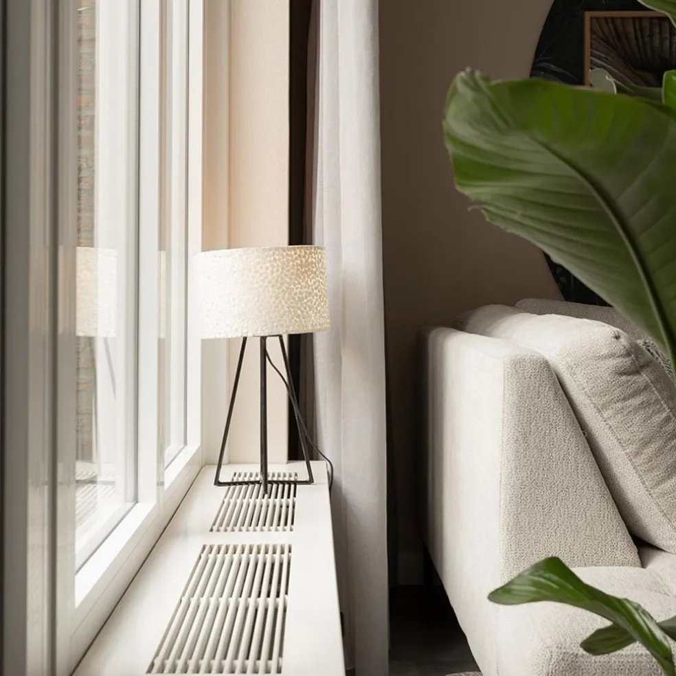 Een leuke moderne lamp met een decoratieve kap. De schelpen kap heeft een parelmoer witte kleur wat mooi past bij de zwarte metalen voet. Door de kleur en de capiz schelpen die in de kap verwerkt zitten, geeft de lamp een mooie sfeervolle verlichting. Deze tafellamp is zowel aan als uit een mooie decoratieve toevoeging aan het interieur die zorgt voor een warme gezellige sfeer.