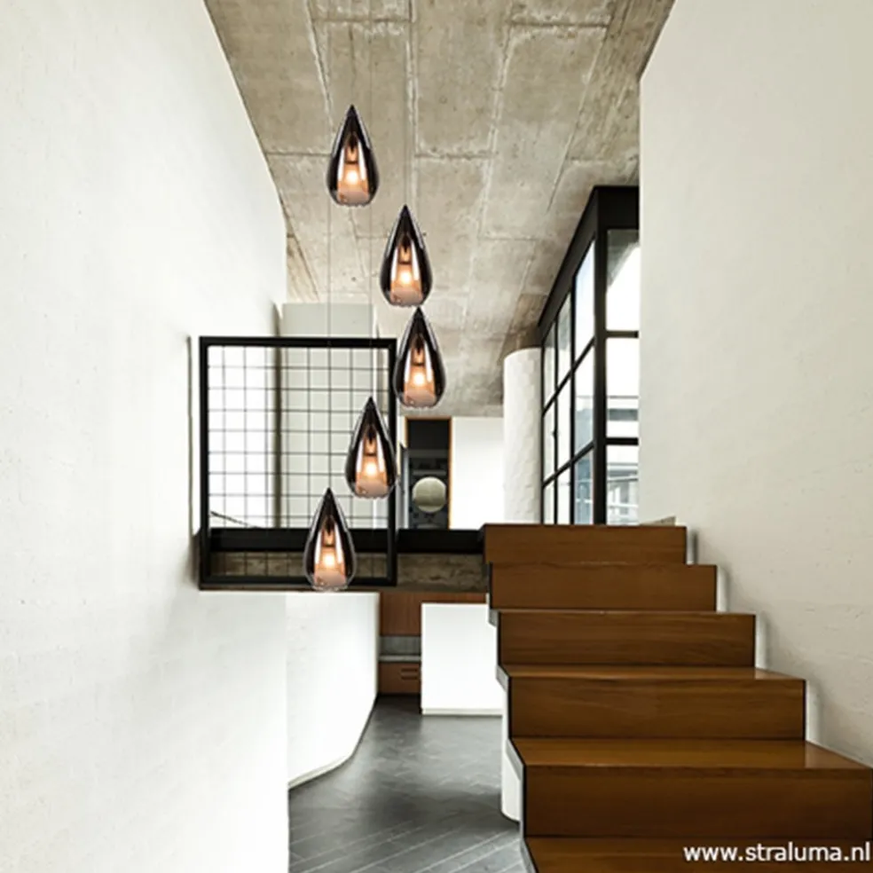 Wat een topper is dit! Sfeervol, modern en luxe in één, deze smokey 5-lichts hanglamp. De lamp past perfect in een vide door z’n hoogte van maar liefst 3 meter. Deze is ook in hoogte te verstellen zodat de hanglamp ook in een lagere ruimte kan komen te hangen. Wat deze videlamp uniek maakt zijn de ‘smokey’ glazen kappen. De kappen hebben zowel een chromen als antraciet transparante look, afhankelijk van het licht in de ruimte en of de lamp wel of niet is ingeschakeld oogt de lamp steeds anders. Dit zorgt voor de luxe en unieke uitstraling, die mooi past in een moderne woning. De kapjes zijn van binnen voorzien van een mat binnenglas die zorgt voor een extra sfeervolle verlichting en tevens dat er niet direct in de lichtbron kan worden gekeken. De glazen kapjes hangen aan een transparant snoer en de lamp wordt met een ronde chromen plafondplaat aan het plafond bevestigd.