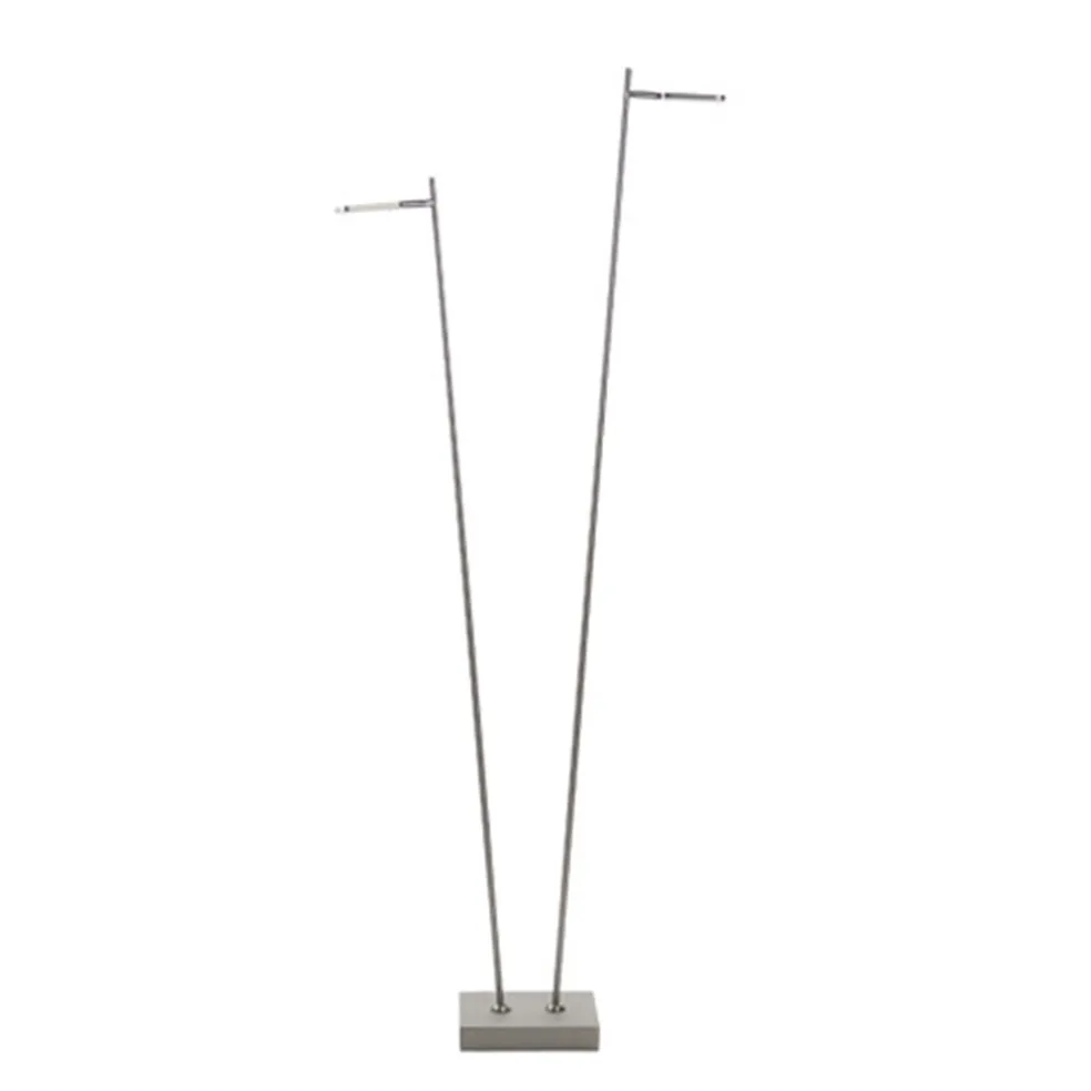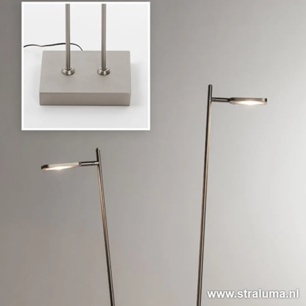 Strakke 2 lichts led vloerlamp Nikkel. Een fraaie verschijning voor in de woon- of werkkamer. Mooi van eenvoud! De verticale stangen zijn d.m.v. een kogelgewrichtje op de rechthoekige voet geplaatst. Hierdoor kunt u de stangen uit elkaar plaatsen, of juist elk een kant op. Door de volledig draai- en kantelbare lichtunits kunt u de lichtbundel richten waar u maar wilt.