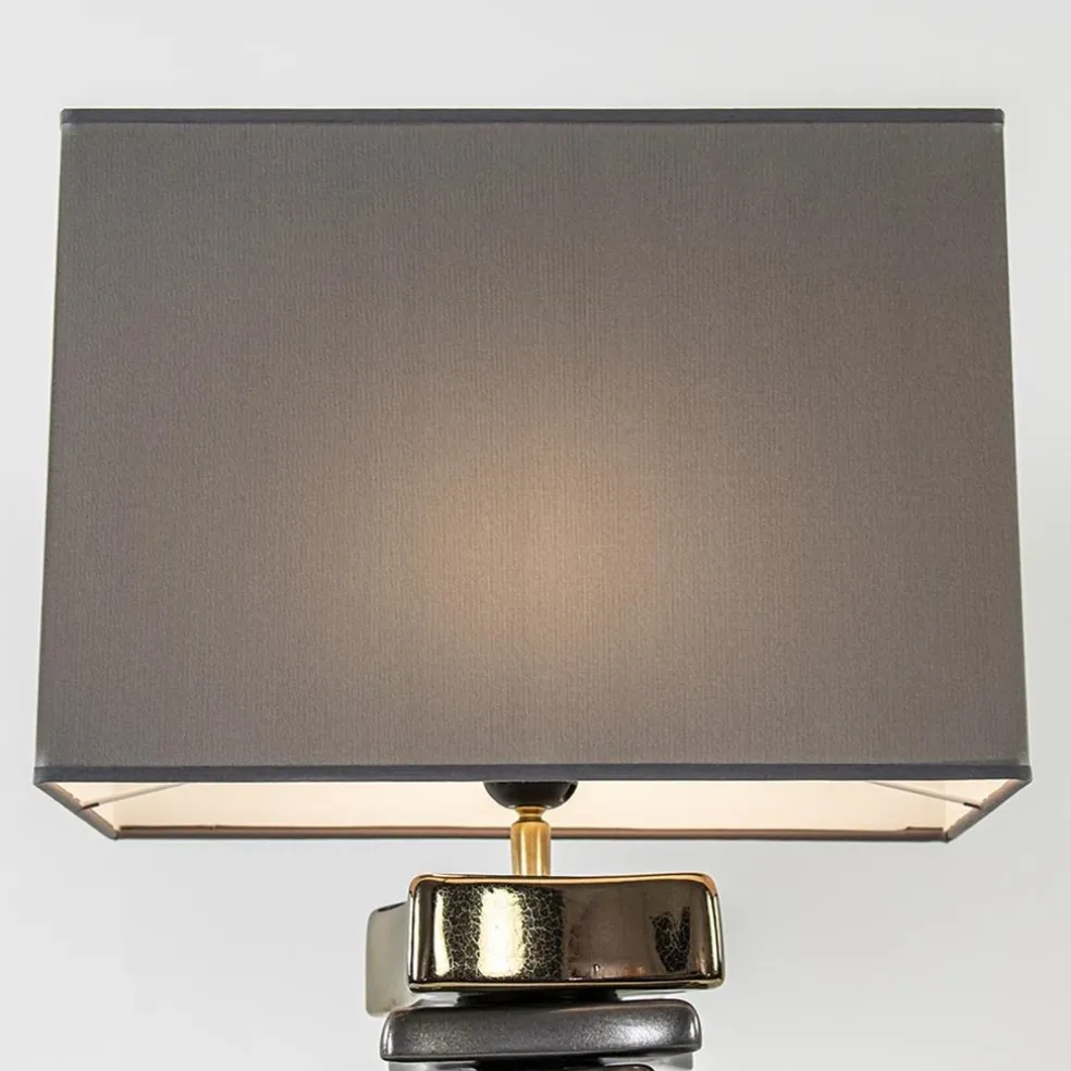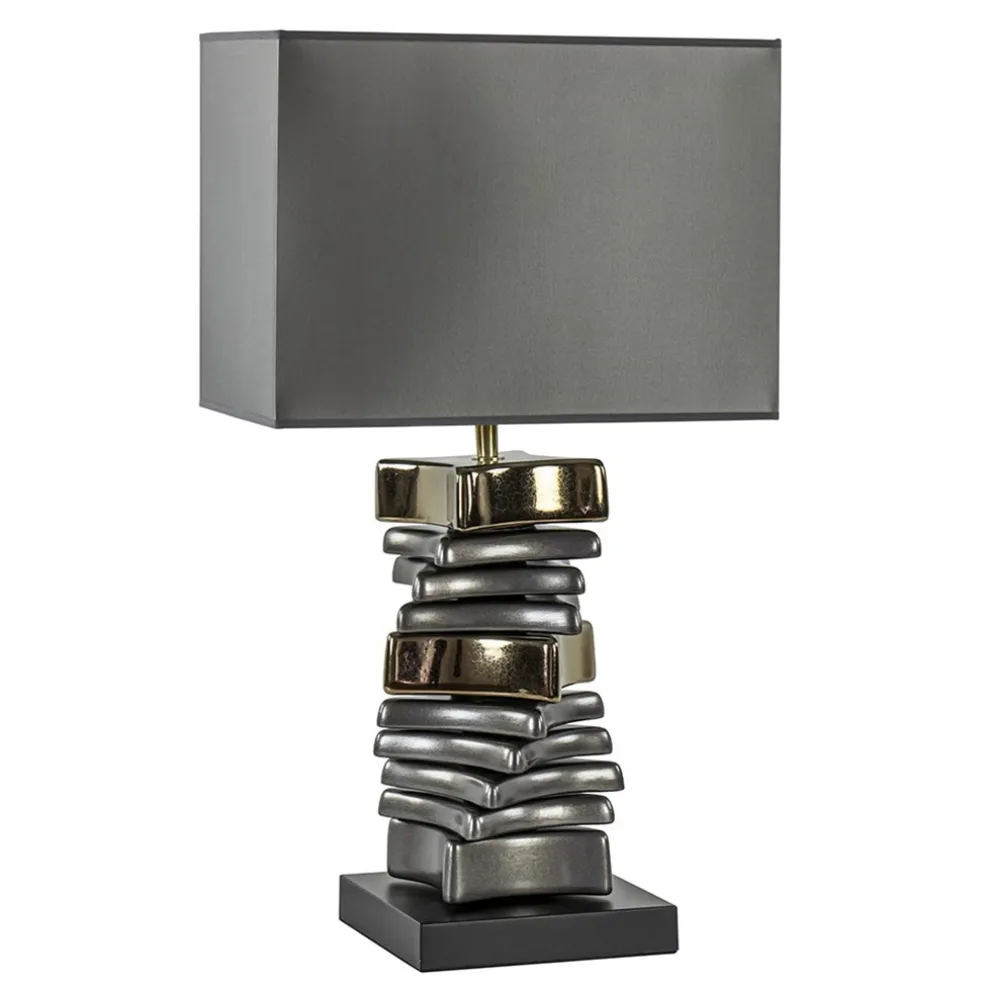 Deze stijlvolle tafellamp is een prachtig exemplaar voor op een dressoir, bijzettafel of zelfs het nachtkastje. Ga voor een chique hotel look in het interieur met deze grijze tafellamp met goud accenten. De schemerlamp heeft een keramieken voet die is opgebouwd uit losse delen. Doordat deze verspringen ontstaat er een speels design wat, mede door het goud dat erin verwerkt is, een luxe uitstraling heeft. De voet is gecombineerd met een rechthoekige grijze kap. De stijlvolle tafellamp heeft een zwart snoer met een lengte van 150 cm en een schakelaar op 30 cm. De lichtbron is exclusief.