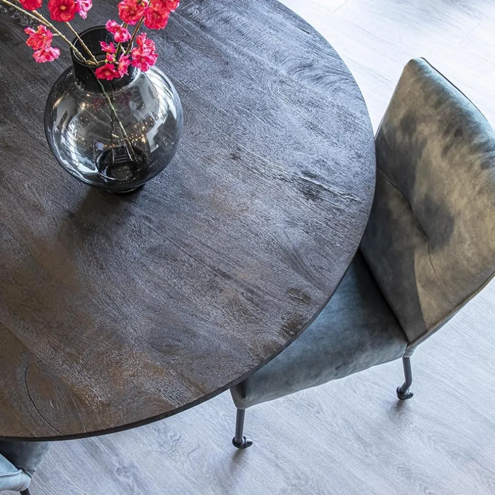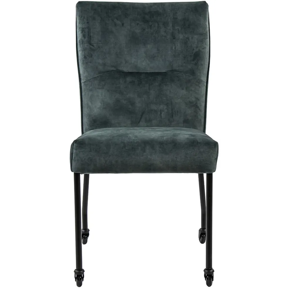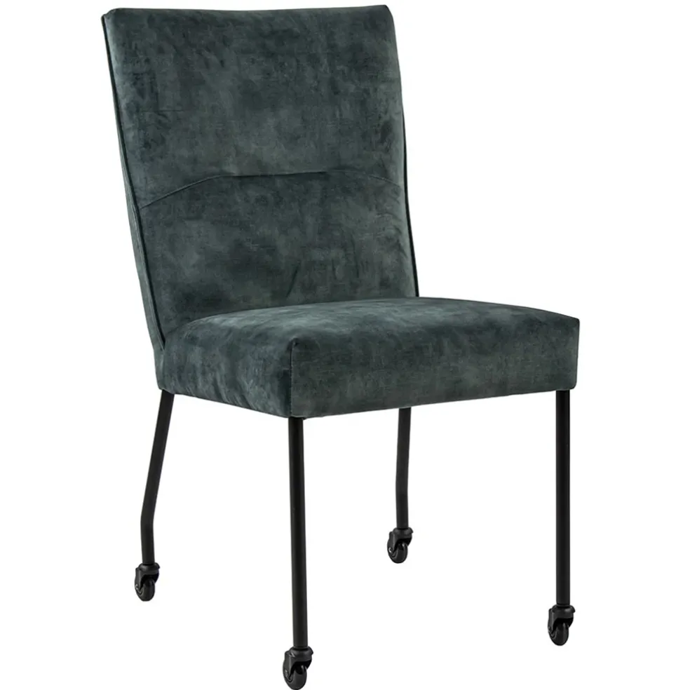 Een fijne eetkamerstoel met een heerlijk zitcomfort. De stoel is voorzien van een stoffen zitting die is uitgevoerd in het blauw/grijs velours. Dit geeft de eetkamerstoel een trendy en chique look. De stoel heeft slanke mat zwarte pootjes die zijn voorzien van wieltjes voor extra comfort.