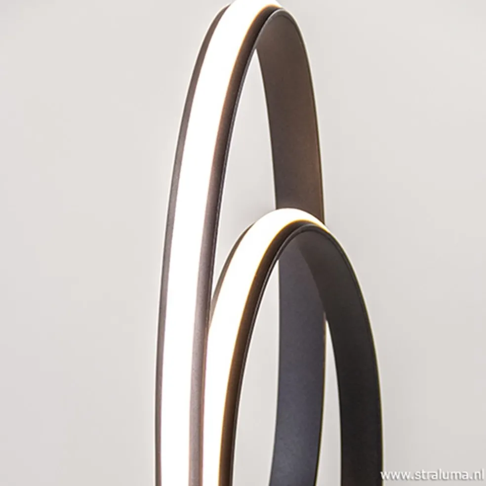 Een moderne ‘design’ tafellamp met elegante lijnen. De LED tafellamp staat op een metalen mat zwarte voet en wordt geleverd inclusief zwart snoer met dimschakelaar. In de kunststof kap zit volledig een LED strip verwerkt. De ronding geeft een speels effect, terwijl de lamp toch een strakke look behoudt. De LED verlichting is met een schuifje op de schakelaar te dimmen en daarnaast is LED ook energiezuinig. Deze tafellamp past mooi in een modern interieur in bijvoorbeeld een woonkamer op het dressoir.