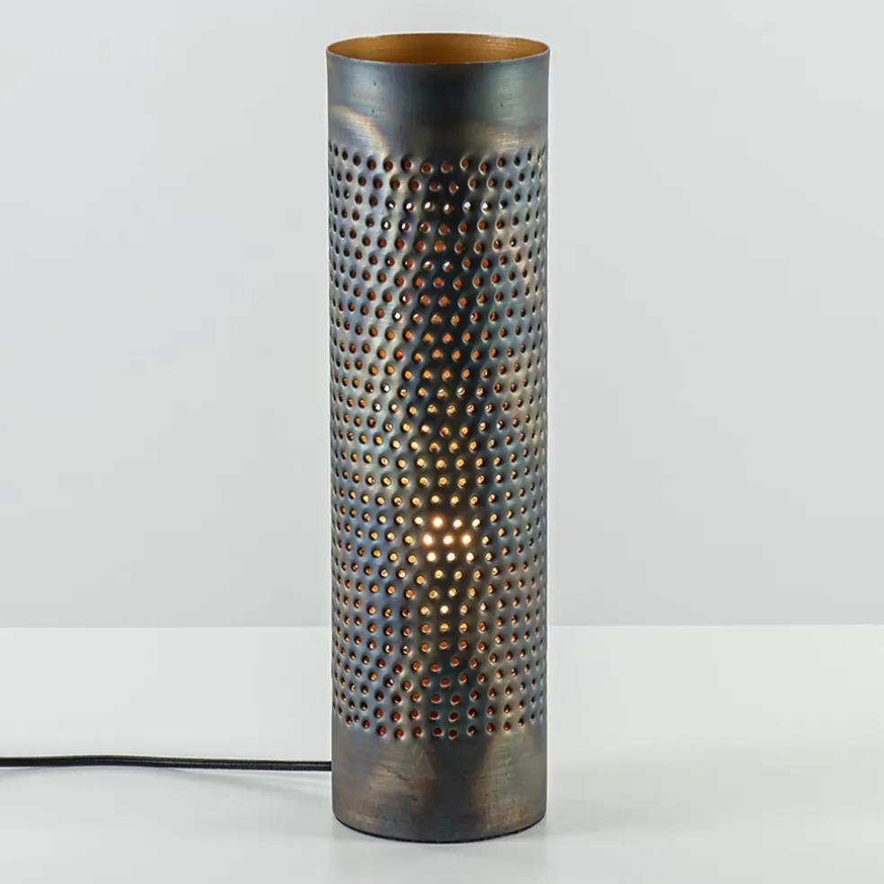 Een originele tafellamp vinden, het klinkt als een lastige opgave, maar dat is het zeker niet! Deze tafellamp gevlamd is namelijk precies wat u zoekt. Deze tafellamp heeft een hele eigen look. Waarom vraagt u zich af? De cilinder kap van deze tafellamp is gevlamd en geperforeerd, waardoor deze lamp een echt authentiek uiterlijk heeft. De binnenkant van de kap is goud gekleurd, wat de tafellamp een hele warme en sfeervolle uitstraling geeft. De metalen tafellamp is voorzien van een zwart snoer met een lengte van 190 cm en een knipschakelaar op 40 cm van de lamp. Deze gevlamde tafellamp wordt geleverd exclusief lichtbron (E27).